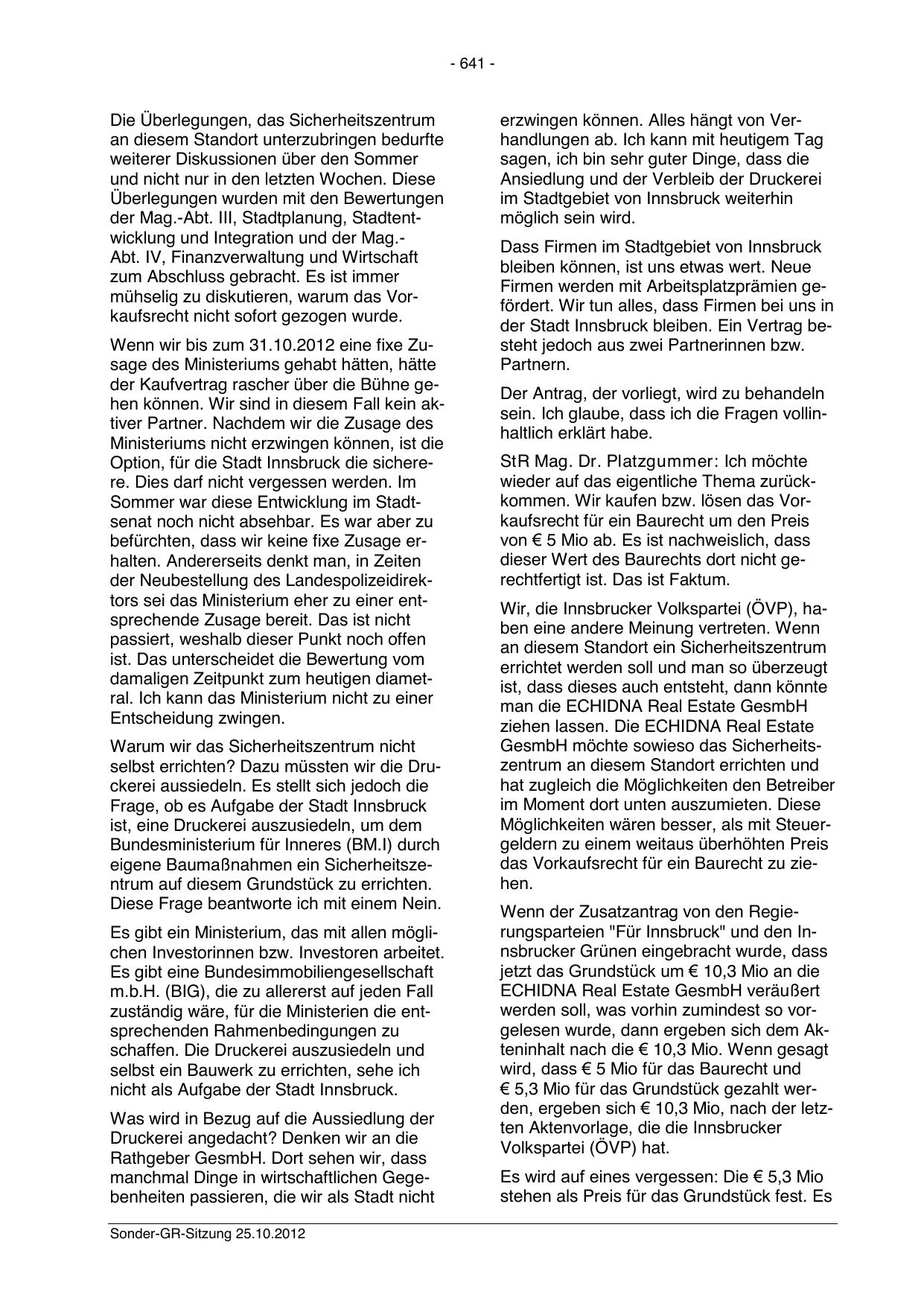 € 5,3 Mio für das Grundstück gezahlt werden, ergeben sich € 10,3 Mio, nach der letzten Aktenvorlage, die die Innsbrucker