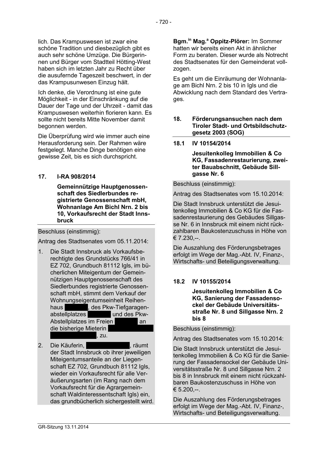 Die Stadt Innsbruck unterstützt die Jesuitenkolleg Immobilien & Co KG für die Fassadenrestaurierung des Gebäudes Sillgasse Nr. 6 in Innsbruck mit einem nicht rückzahlbaren Baukostenzuschuss in Höhe von