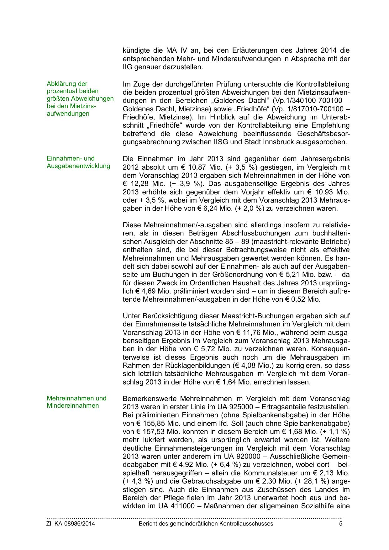 Voranschlag 2013 in der Höhe von € 11,76 Mio., während beim ausgabenseitigen Ergebnis im Vergleich zum Voranschlag 2013 Mehrausgaben in der Höhe von € 5,72 Mio. zu verzeichnen waren. Konsequenterweise ist dieses Ergebnis auch noch um die Mehrausgaben im