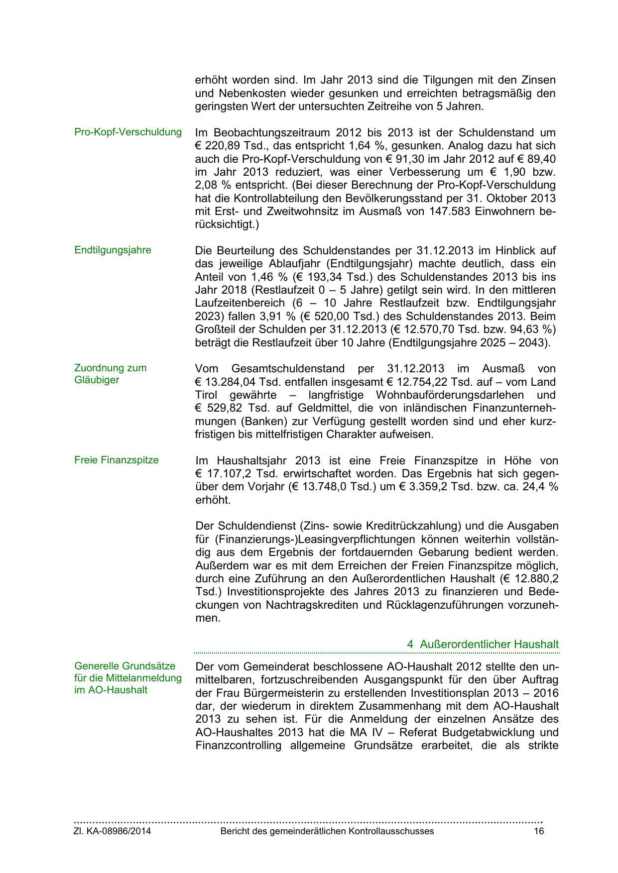 Die Beurteilung des Schuldenstandes per 31.12.2013 im Hinblick auf