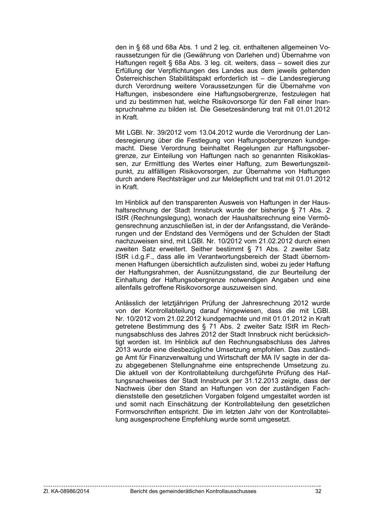 Die aktuell von der Kontrollabteilung durchgeführte Prüfung des Haftungsnachweises der Stadt Innsbruck per 31.12.2013 zeigte, dass der