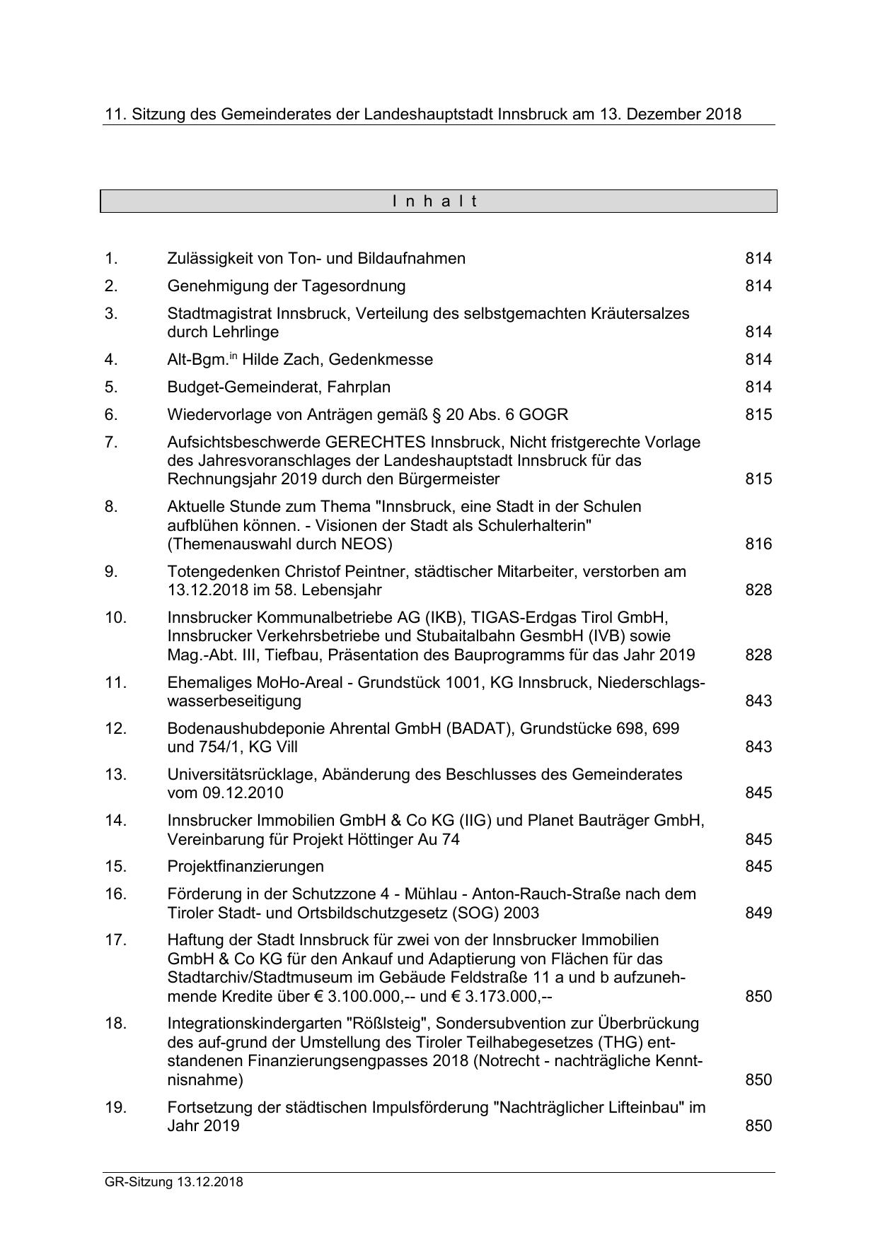 11. Sitzung des Gemeinderates der Landeshauptstadt Innsbruck am 13. Dezember 2018