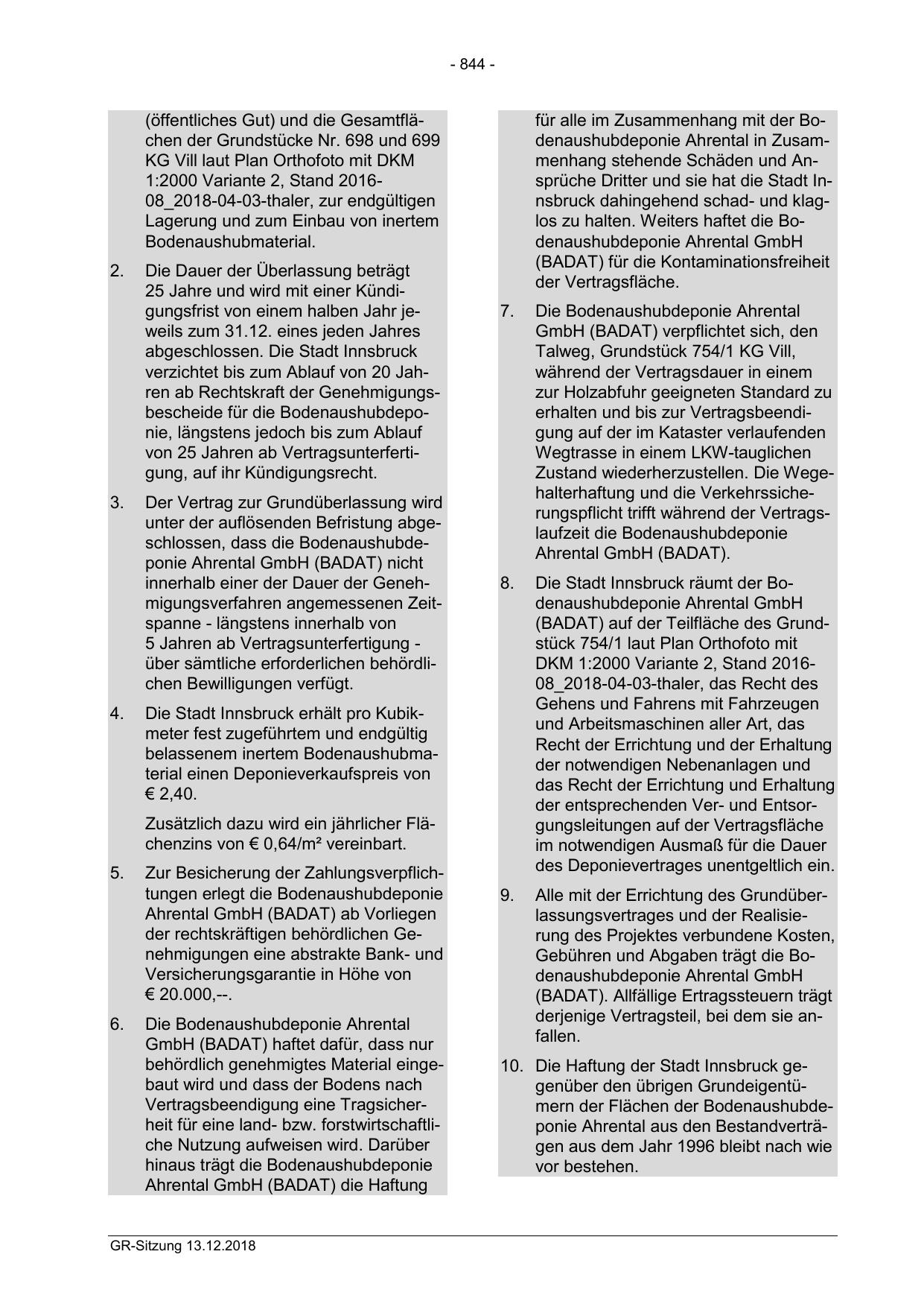10. Die Haftung der Stadt Innsbruck gegenüber den übrigen Grundeigentümern der Flächen der Bodenaushubdeponie Ahrental aus den Bestandverträgen aus dem Jahr 1996 bleibt nach wie