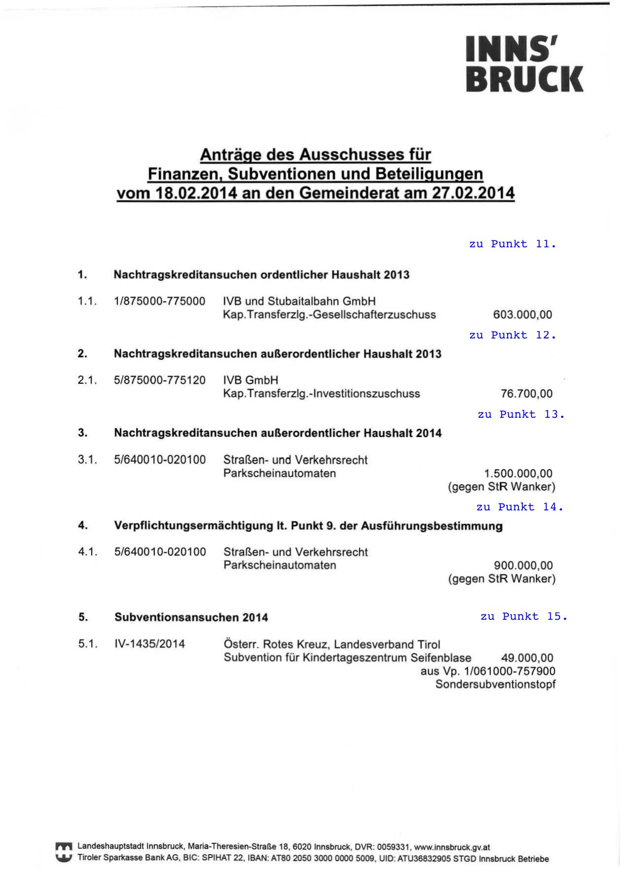 Nachtragskreditansuchen außerordentlicher Haushalt 2014