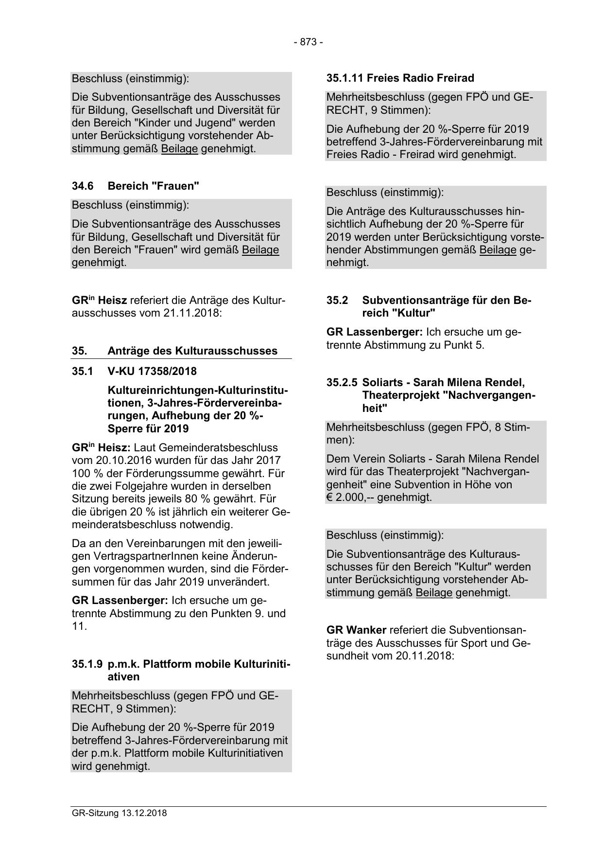 Mehrheitsbeschluss (gegen FPÖ und GERECHT, 9 Stimmen):