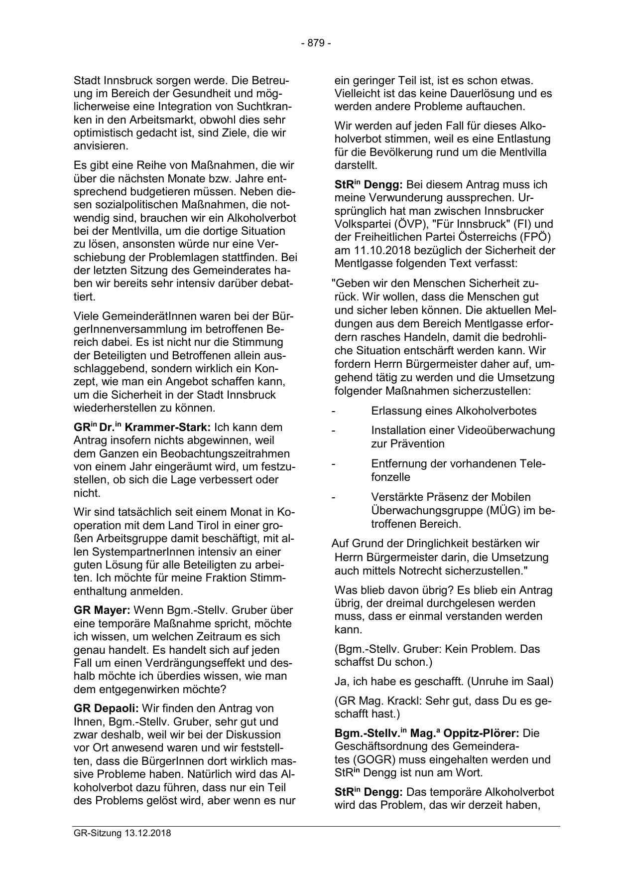 vor Ort anwesend waren und wir feststellten, dass die BürgerInnen dort wirklich massive Probleme haben. Natürlich wird das Alkoholverbot dazu führen, dass nur ein Teil