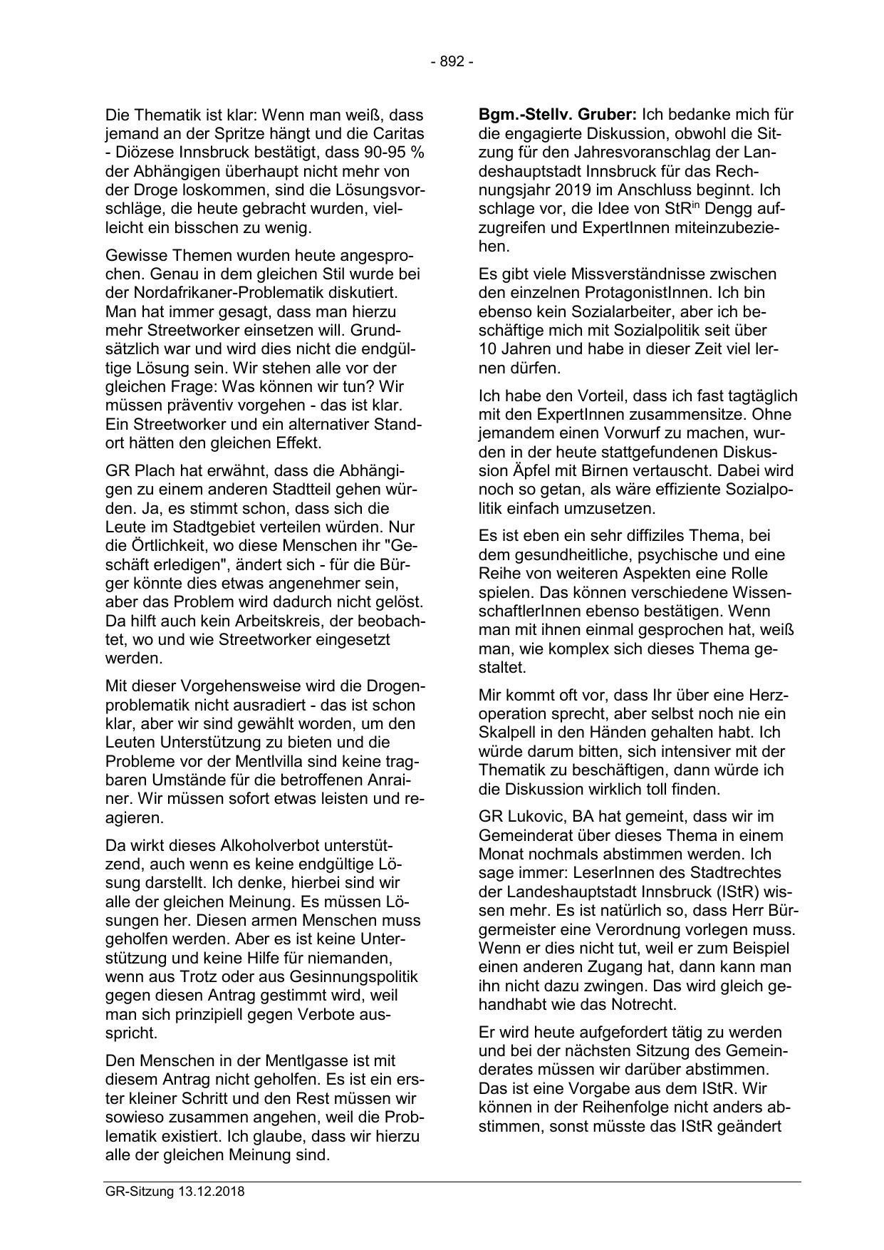 die engagierte Diskussion, obwohl die Sitzung für den Jahresvoranschlag der Landeshauptstadt Innsbruck für das Rechnungsjahr 2019 im Anschluss beginnt. Ich
