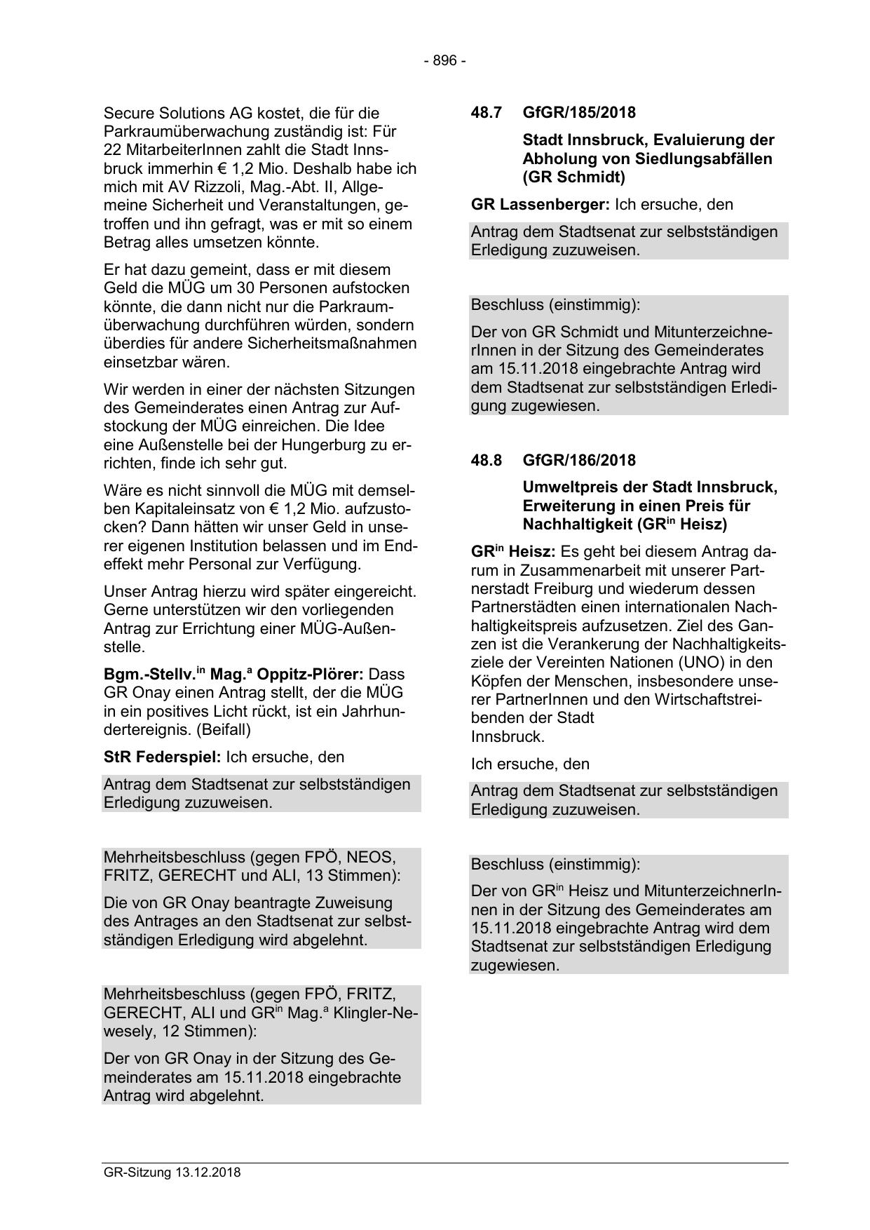 dem Stadtsenat zur selbstständigen Erledigung zugewiesen.