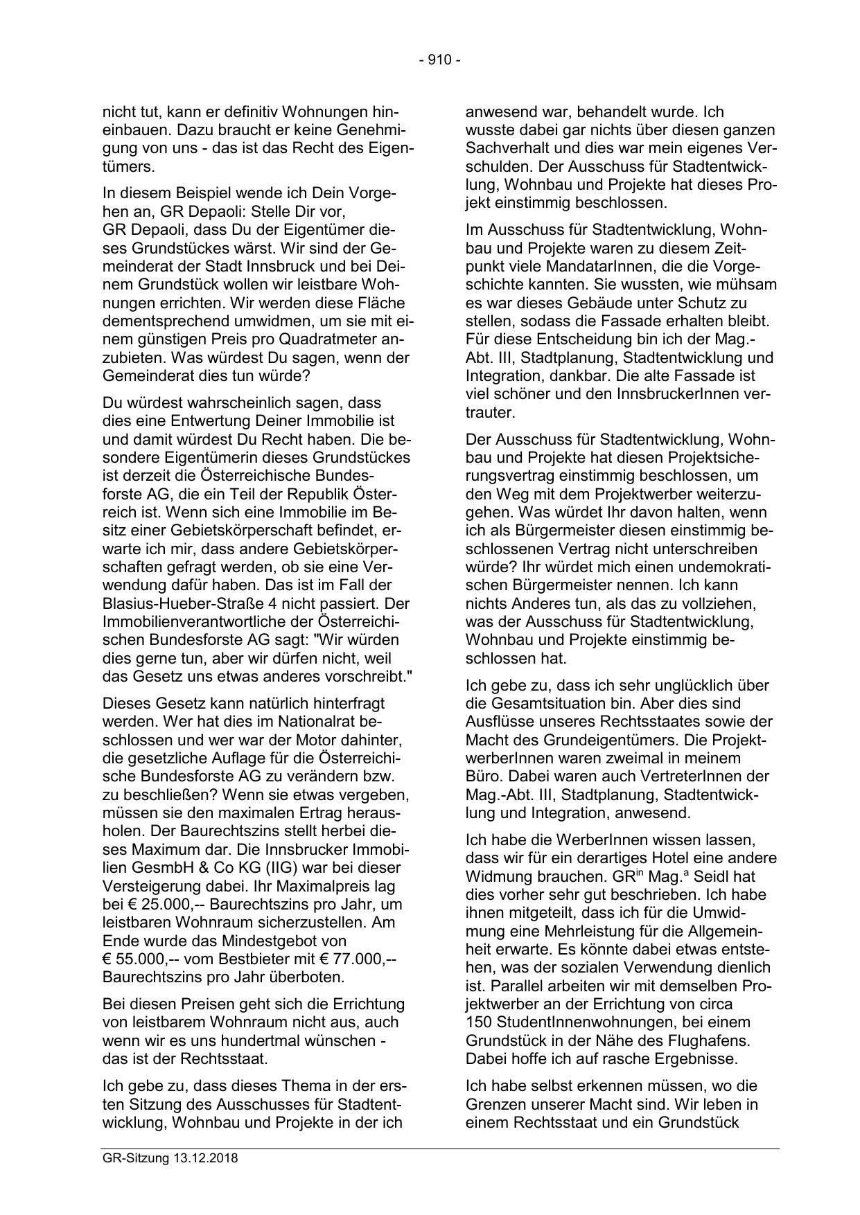 GR Depaoli, dass Du der Eigentümer dieses Grundstückes wärst. Wir sind der Gemeinderat der Stadt Innsbruck und bei Deinem Grundstück wollen wir leistbare Wohnungen errichten. Wir werden diese Fläche