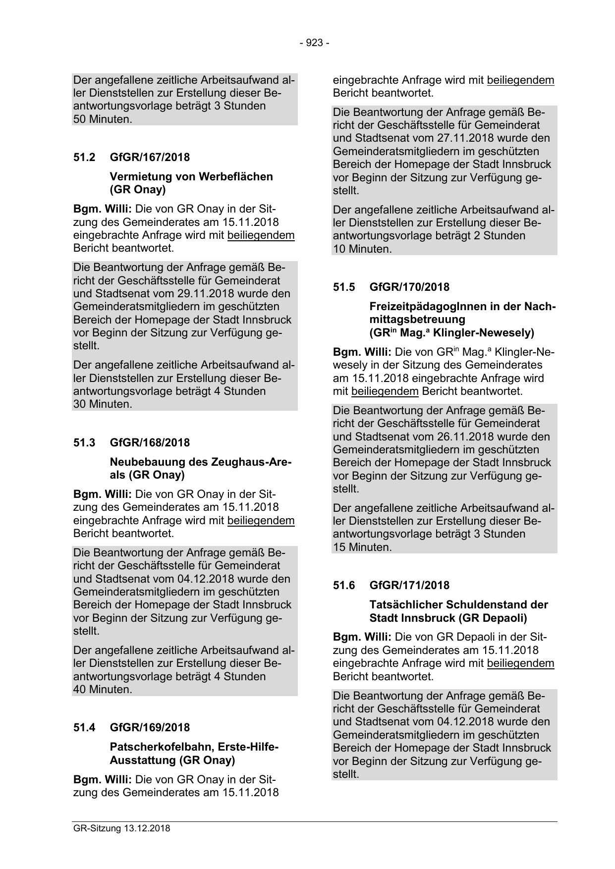 Bgm. Willi: Die von GR Onay in der Sitzung des Gemeinderates am 15.11.2018
