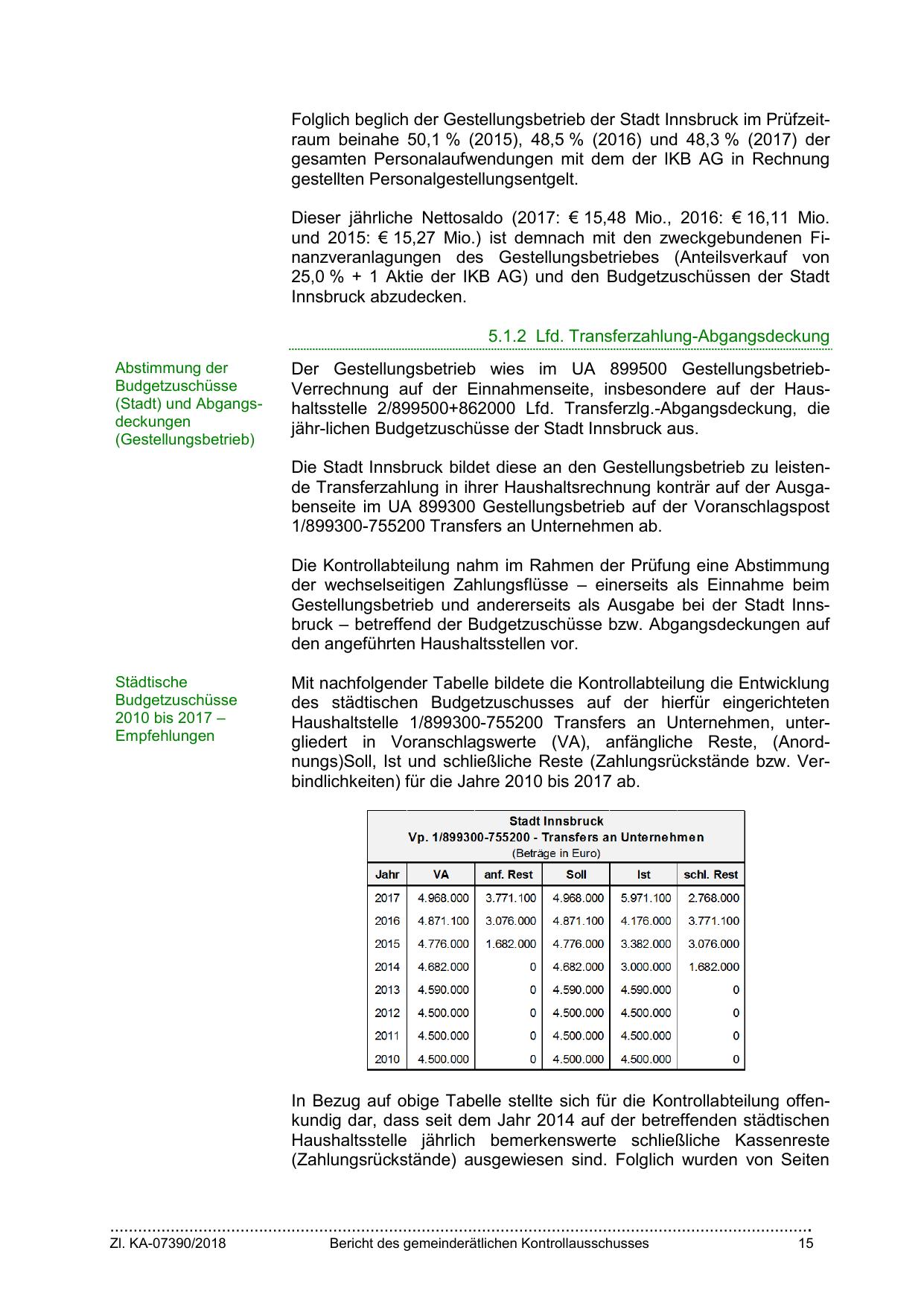 Folglich beglich der Gestellungsbetrieb der Stadt Innsbruck im Prüfzeitraum beinahe 50,1 % (2015), 48,5 % (2016) und 48,3 % (2017) der