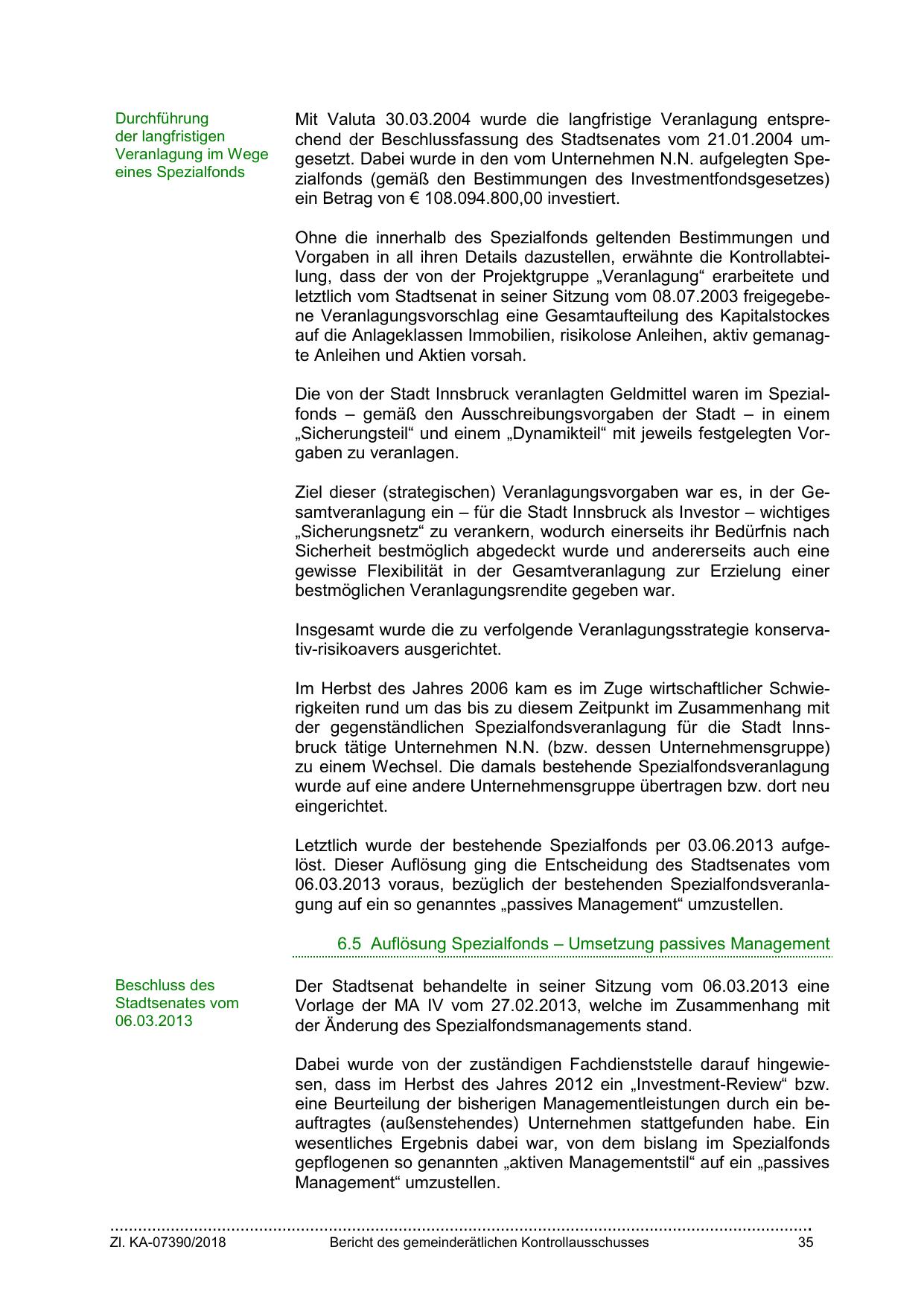 Mit Valuta 30.03.2004 wurde die langfristige Veranlagung entsprechend der Beschlussfassung des Stadtsenates vom 21.01.2004 umgesetzt. Dabei wurde in den vom Unternehmen N.N. aufgelegten Spezialfonds (gemäß den Bestimmungen des Investmentfondsgesetzes)