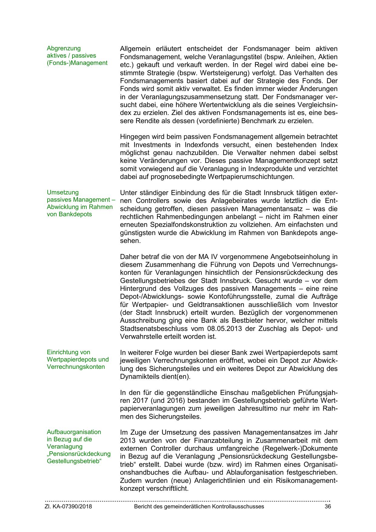 Unter ständiger Einbindung des für die Stadt Innsbruck tätigen externen Controllers sowie des Anlagebeirates wurde letztlich die Entscheidung getroffen, diesen passiven Managementansatz – was die