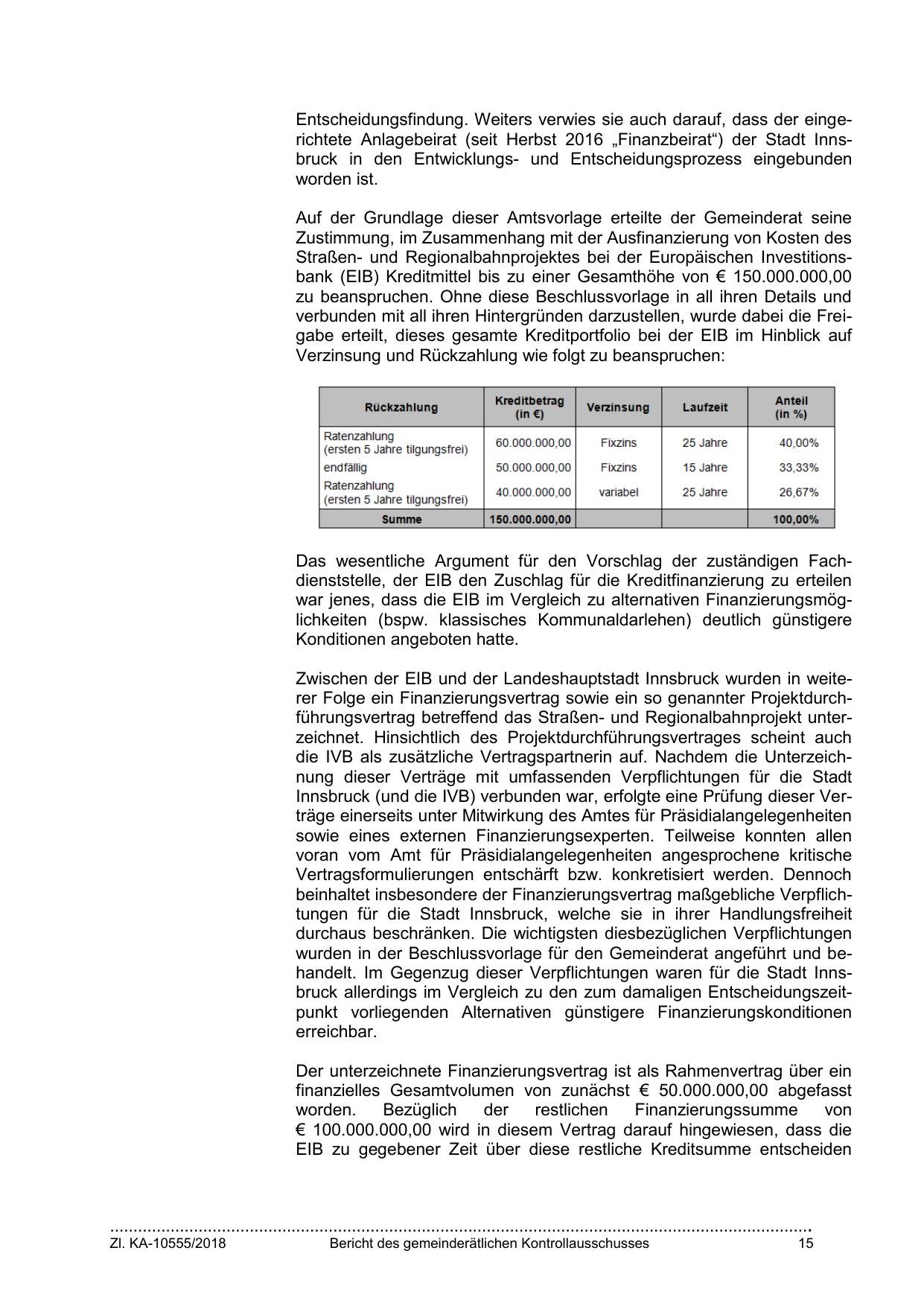 Entscheidungsfindung. Weiters verwies sie auch darauf, dass der eingerichtete Anlagebeirat (seit Herbst 2016 „Finanzbeirat“) der Stadt Innsbruck in den Entwicklungs- und Entscheidungsprozess eingebunden