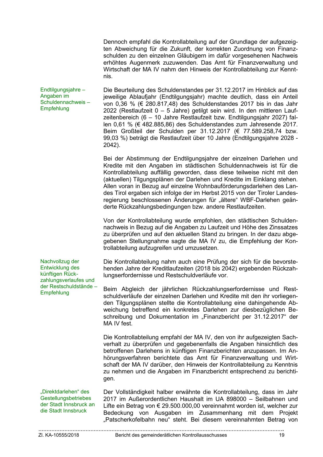 Beim Abgleich der jährlichen Rückzahlungserfordernisse und Restschuldverläufe der einzelnen Darlehen und Kredite mit den ihr vorliegenden Tilgungsplänen stellte die Kontrollabteilung eine dahingehende Abweichung betreffend ein konkretes Darlehen zur diesbezüglichen Beschreibung und Dokumentation im „Finanzbericht per 31.12.2017“ der