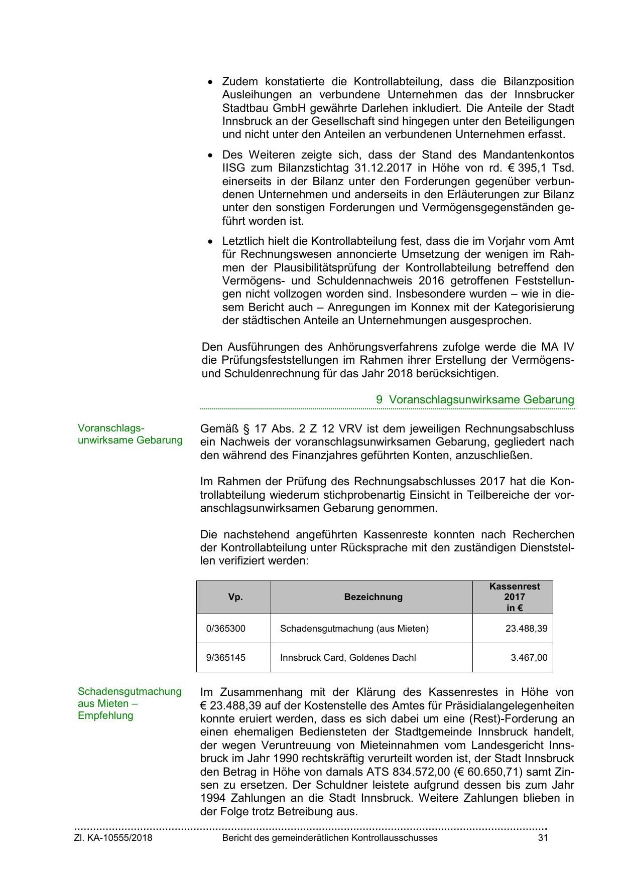 Im Rahmen der Prüfung des Rechnungsabschlusses 2017 hat die Kontrollabteilung wiederum stichprobenartig Einsicht in Teilbereiche der voranschlagsunwirksamen Gebarung genommen.
