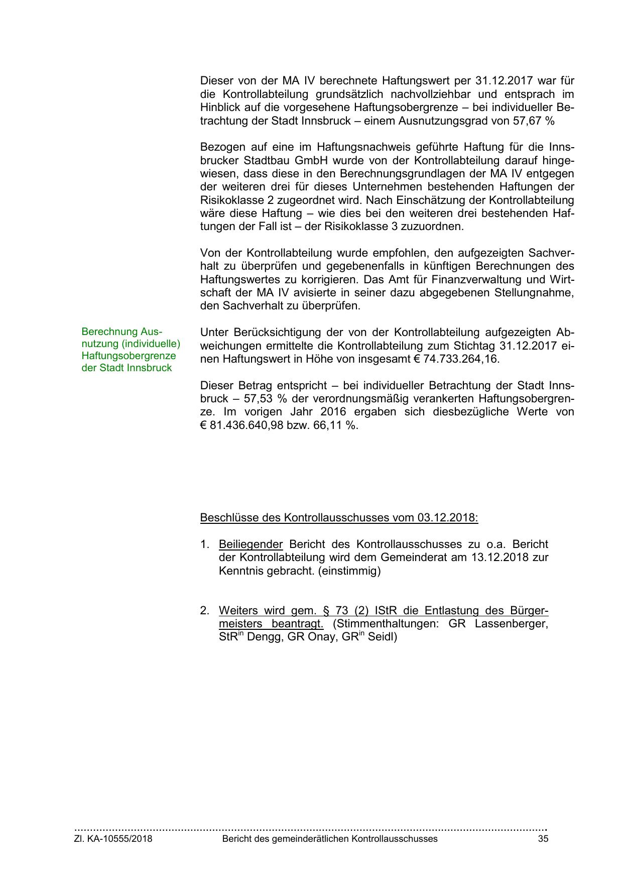 Dieser Betrag entspricht – bei individueller Betrachtung der Stadt Innsbruck – 57,53 % der verordnungsmäßig verankerten Haftungsobergrenze. Im vorigen Jahr 2016 ergaben sich diesbezügliche Werte von