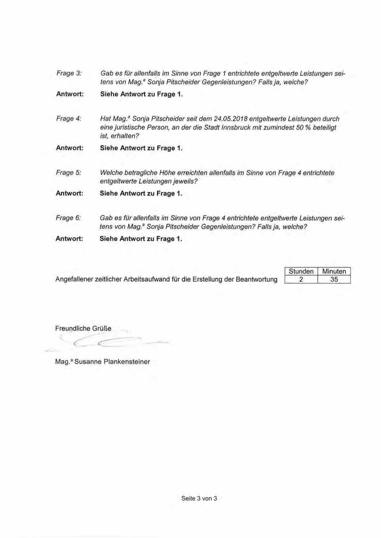 Hat Mag. 8 Sonja Pitscheider seit dem 24.05.2018 entgeltwerte Leistungen durch