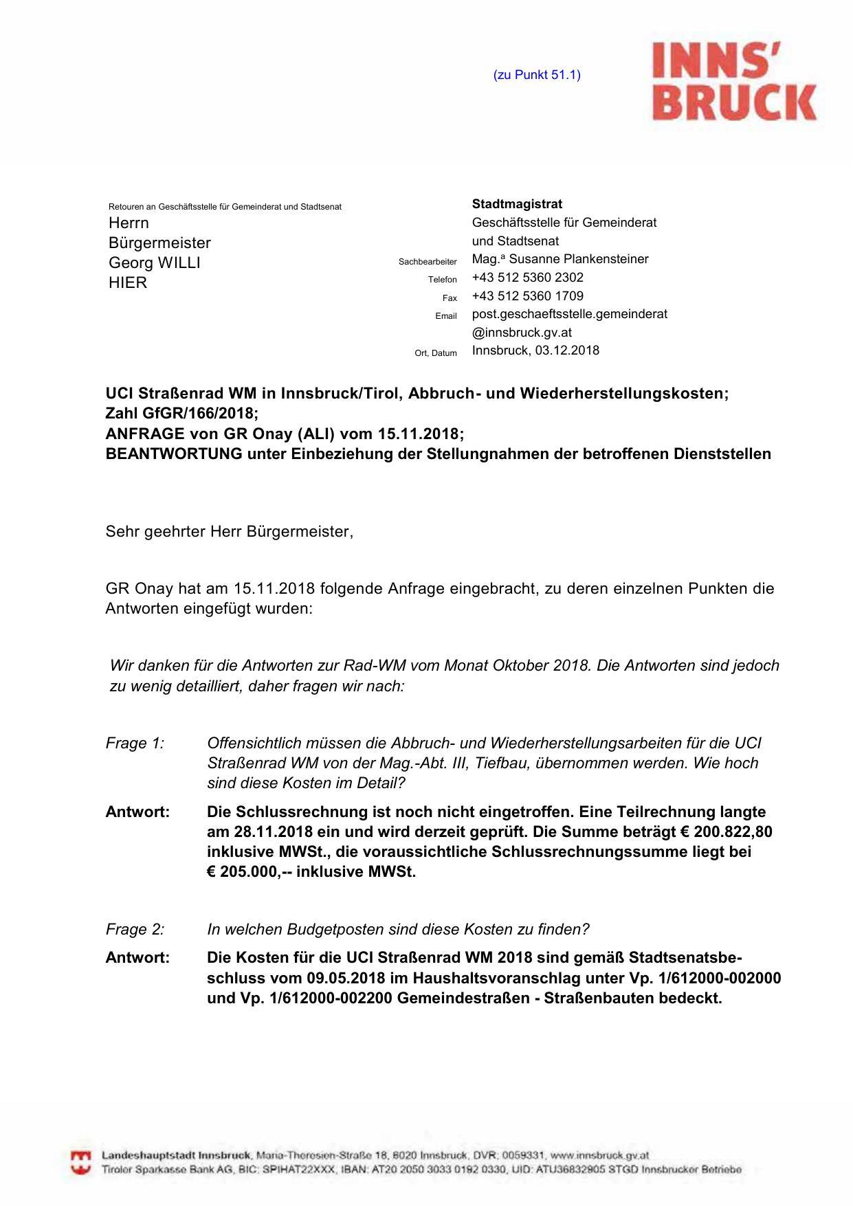GR Onay hat am 15.11.2018 folgende Anfrage eingebracht, zu deren einzelnen Punkten die