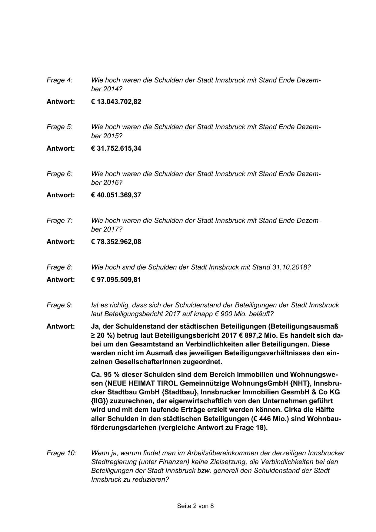 Beteiligungen der Stadt Innsbruck bzw. generell den Schuldenstand der Stadt