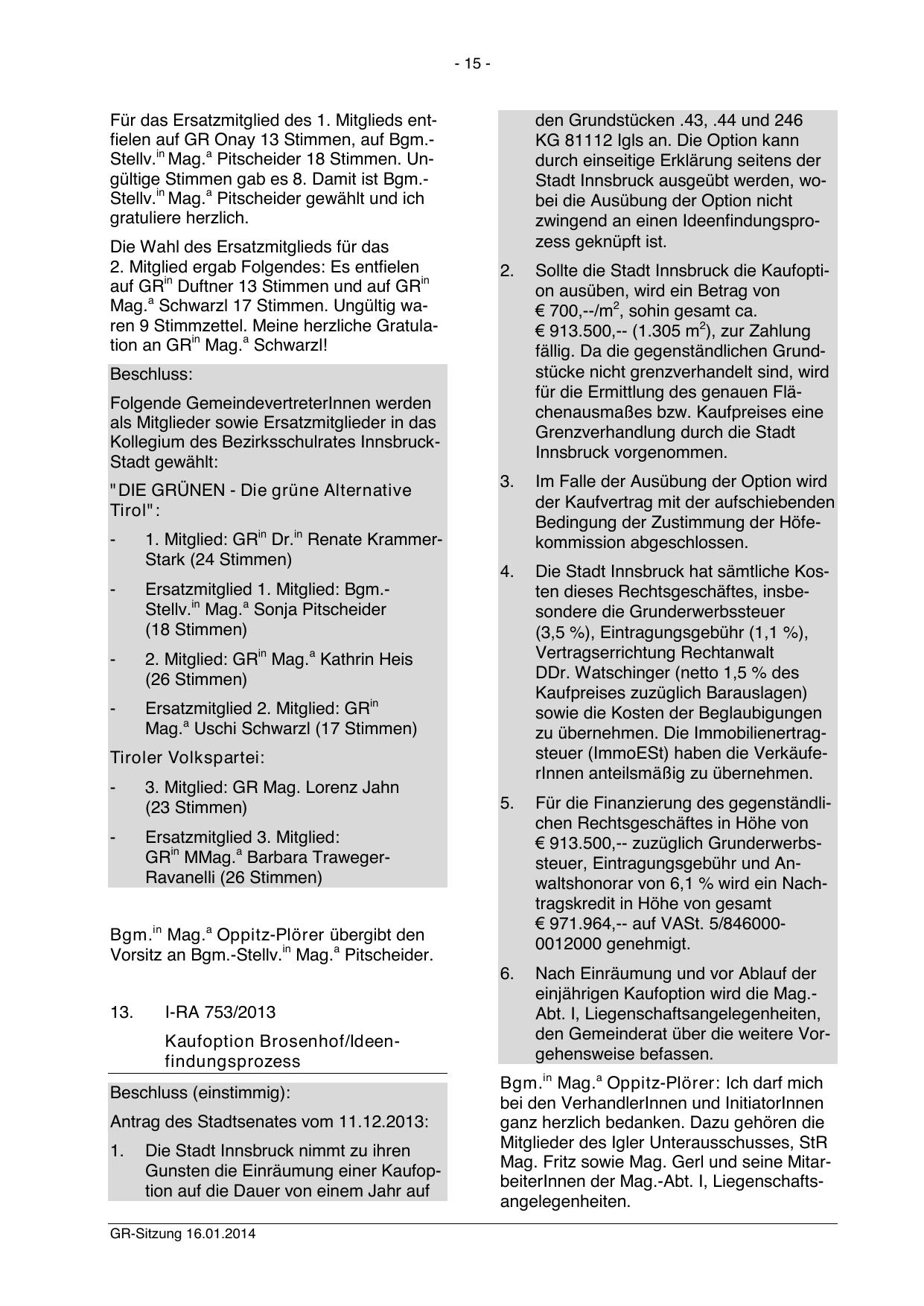 Mag.a Schwarzl 17 Stimmen. Ungültig waren 9 Stimmzettel. Meine herzliche Gratulation an GRin Mag.a Schwarzl!