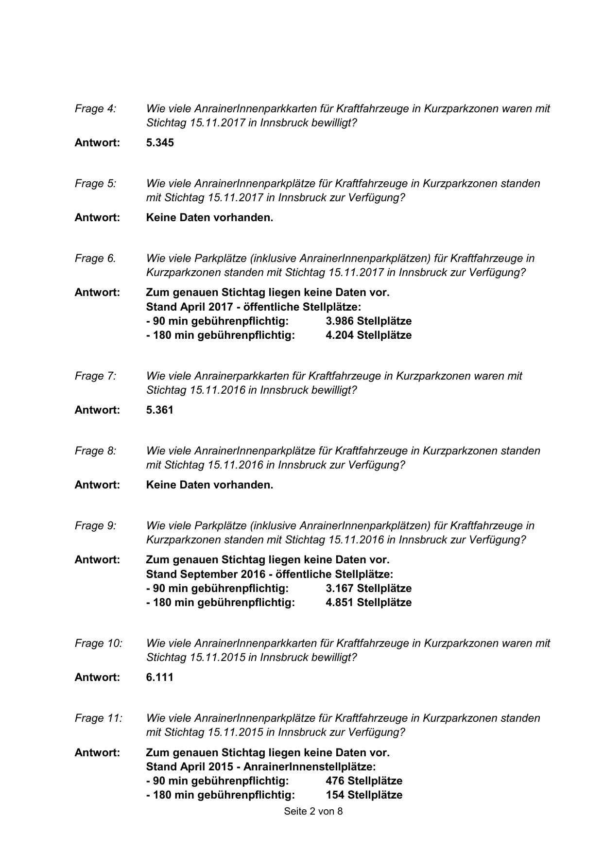Kurzparkzonen standen mit Stichtag 15.11.2017 in Innsbruck zur Verfügung?