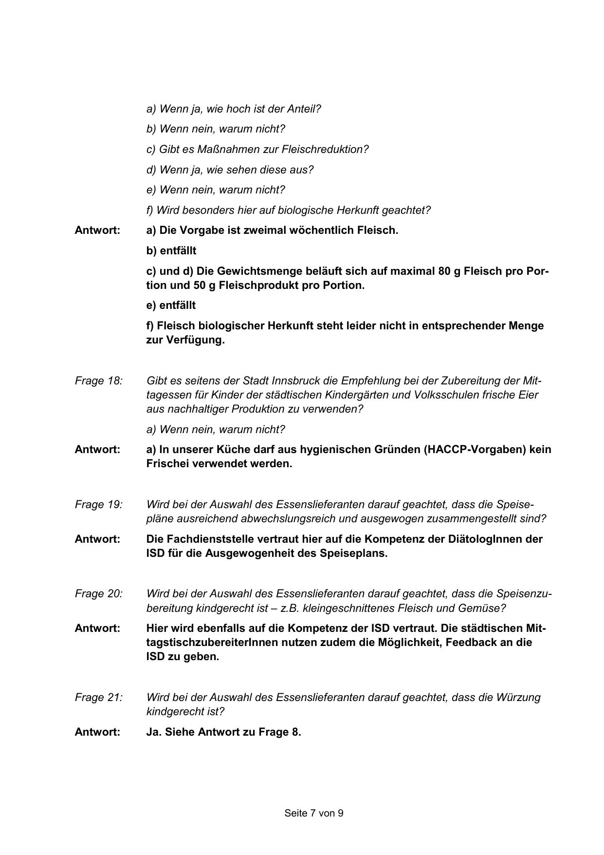 Gibt es seitens der Stadt Innsbruck die Empfehlung bei der Zubereitung der Mittagessen für Kinder der städtischen Kindergärten und Volksschulen frische Eier