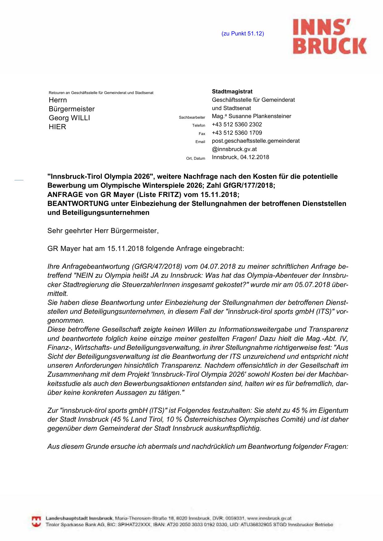 Ihre Anfragebeantwortung (GfGR/47/2018) vom 04.07.2018 zu meiner schriftlichen Anfrage betreffend "NEIN zu Olympia heißt JA zu Innsbruck: Was hat das Olympia-Abenteuer der Innsbrucker Stadtregierung die SteuerzahlerInnen insgesamt gekostet?" wurde mir am 05.07.2018 übermittelt.