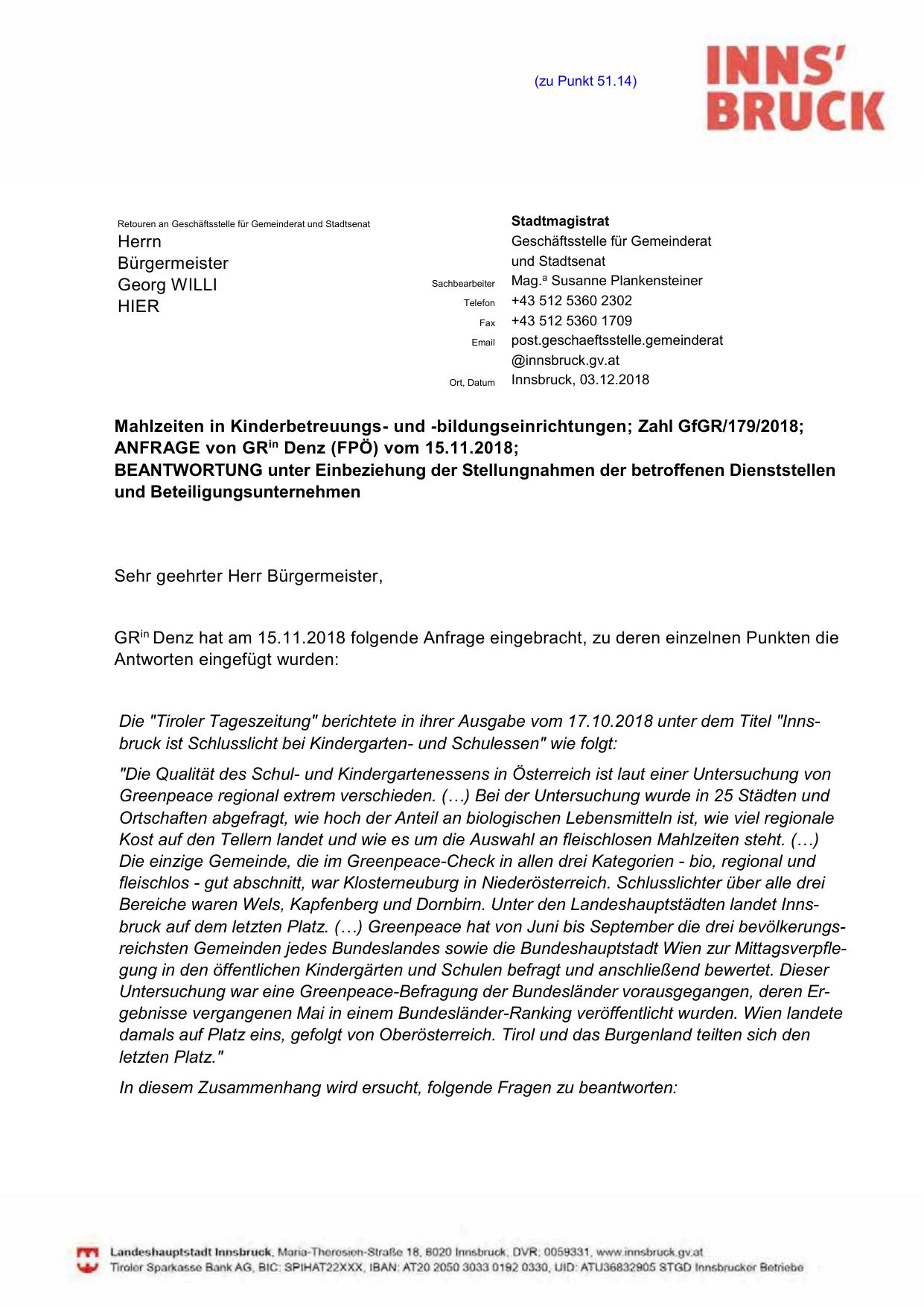 Die "Tiroler Tageszeitung" berichtete in ihrer Ausgabe vom 17.10.2018 unter dem Titel "Innsbruck ist Schlusslicht bei Kindergarten- und Schulessen" wie folgt: