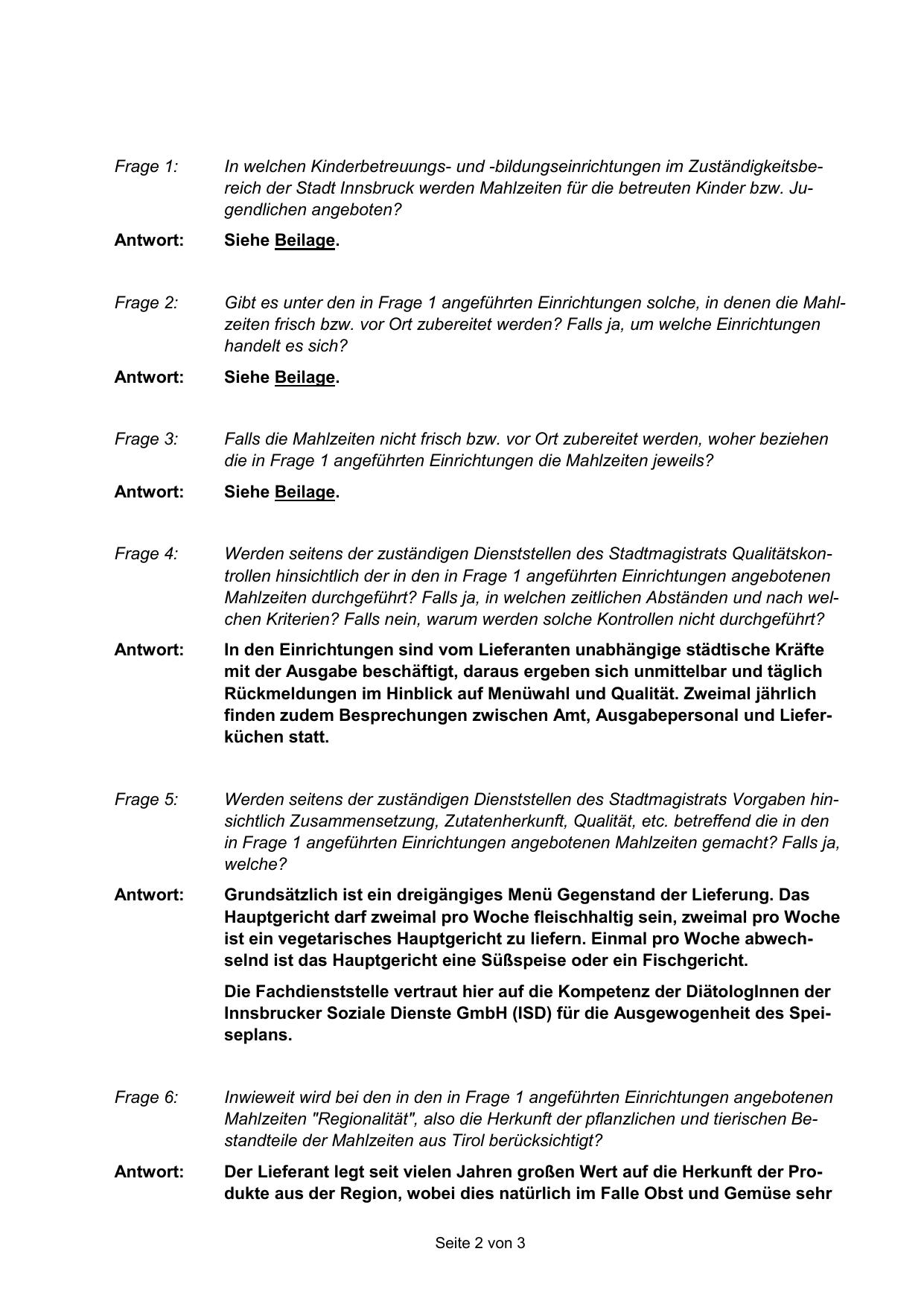 in Frage 1 angeführten Einrichtungen angebotenen Mahlzeiten gemacht? Falls ja,