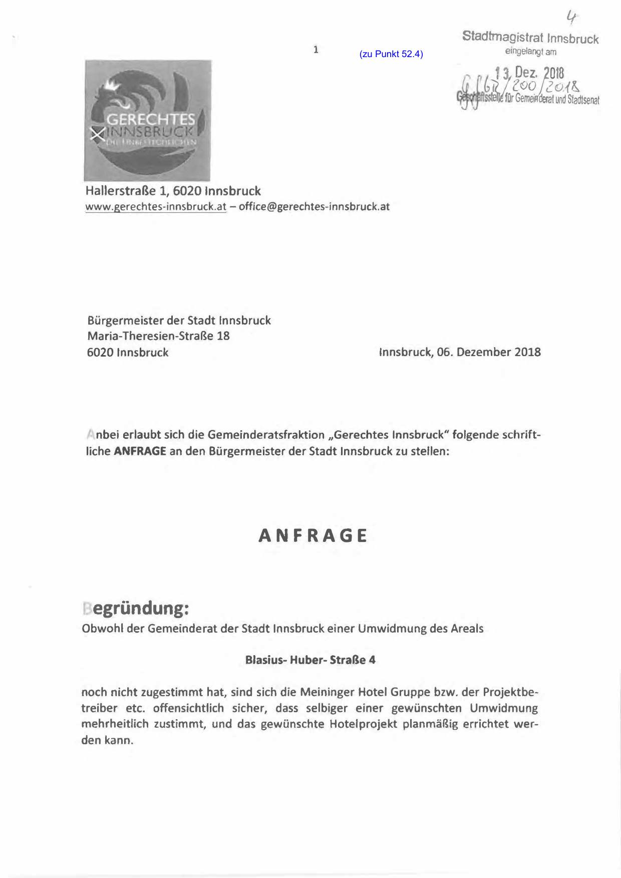 nbei erlaubt sich die Gemeinderatsfraktion „Gerechtes Innsbruck" folgende schrift­
