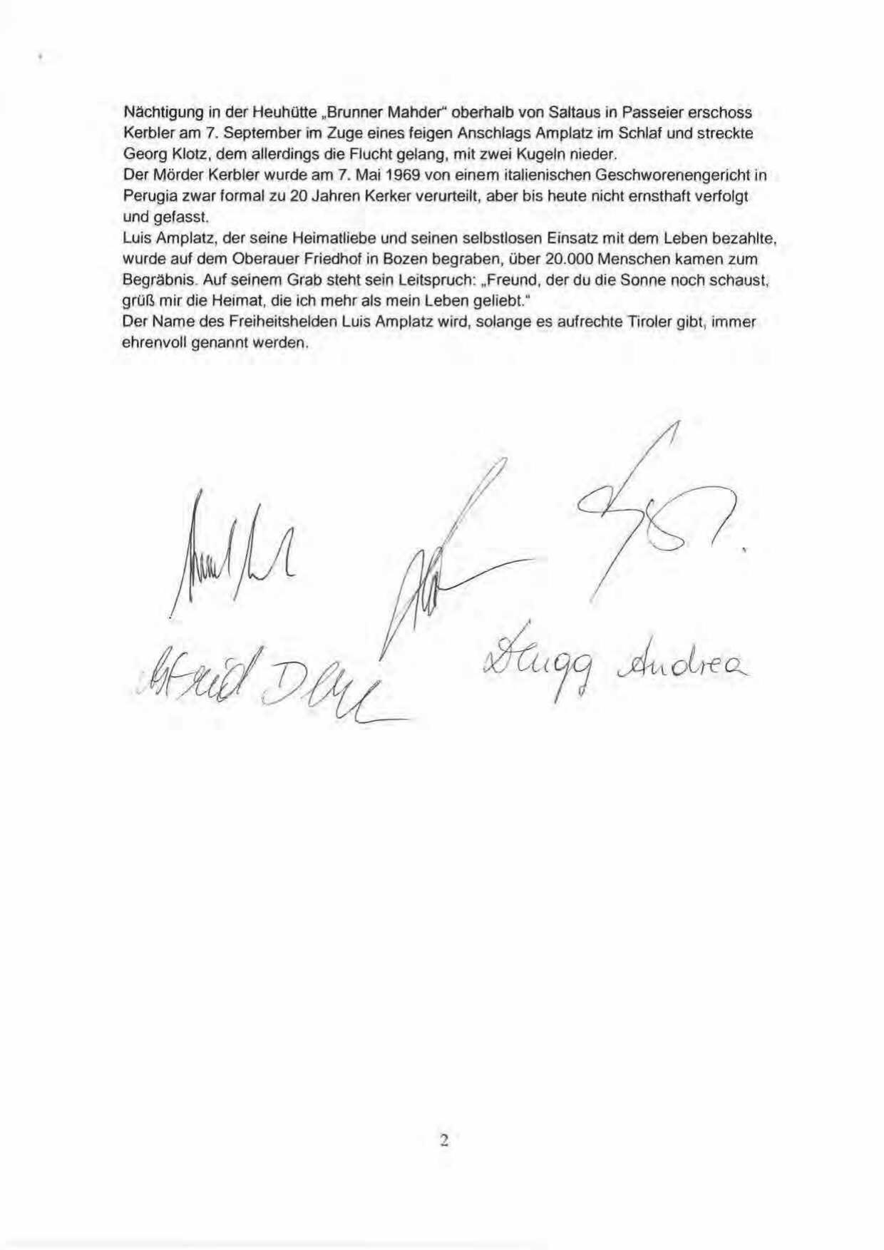 Der Name des Freiheitshelden Luis Am platz wird, solange es aufrechte Tiroler gibt, immer