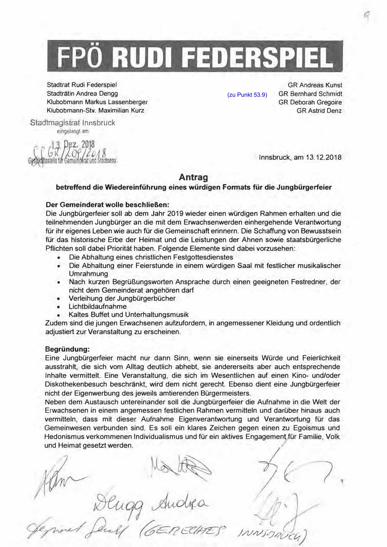 betreffend die Wiedereinführung eines würdigen Formats für die Jungbürgerfeier