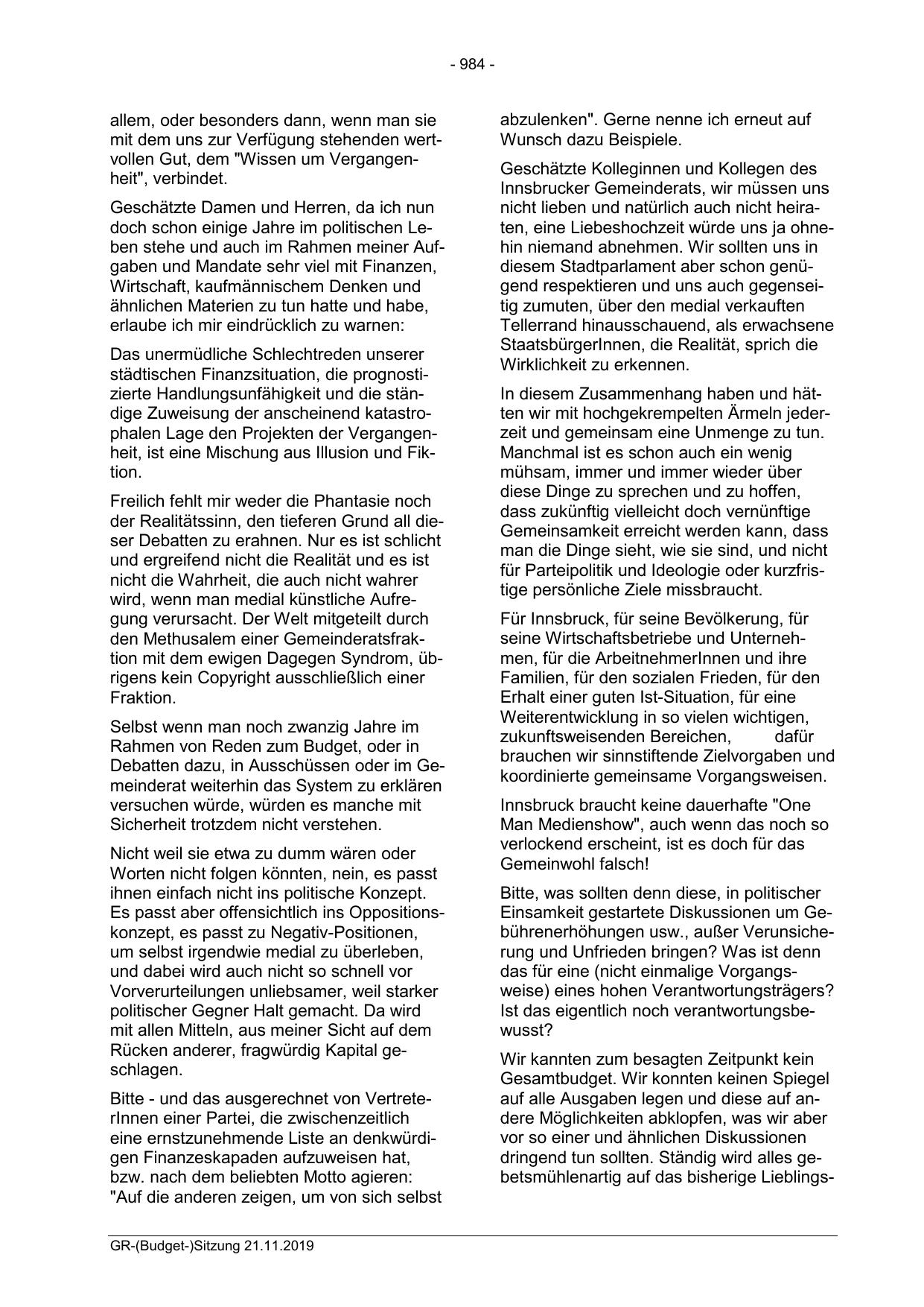 diesem Stadtparlament aber schon genügend respektieren und uns auch gegenseitig zumuten, über den medial verkauften