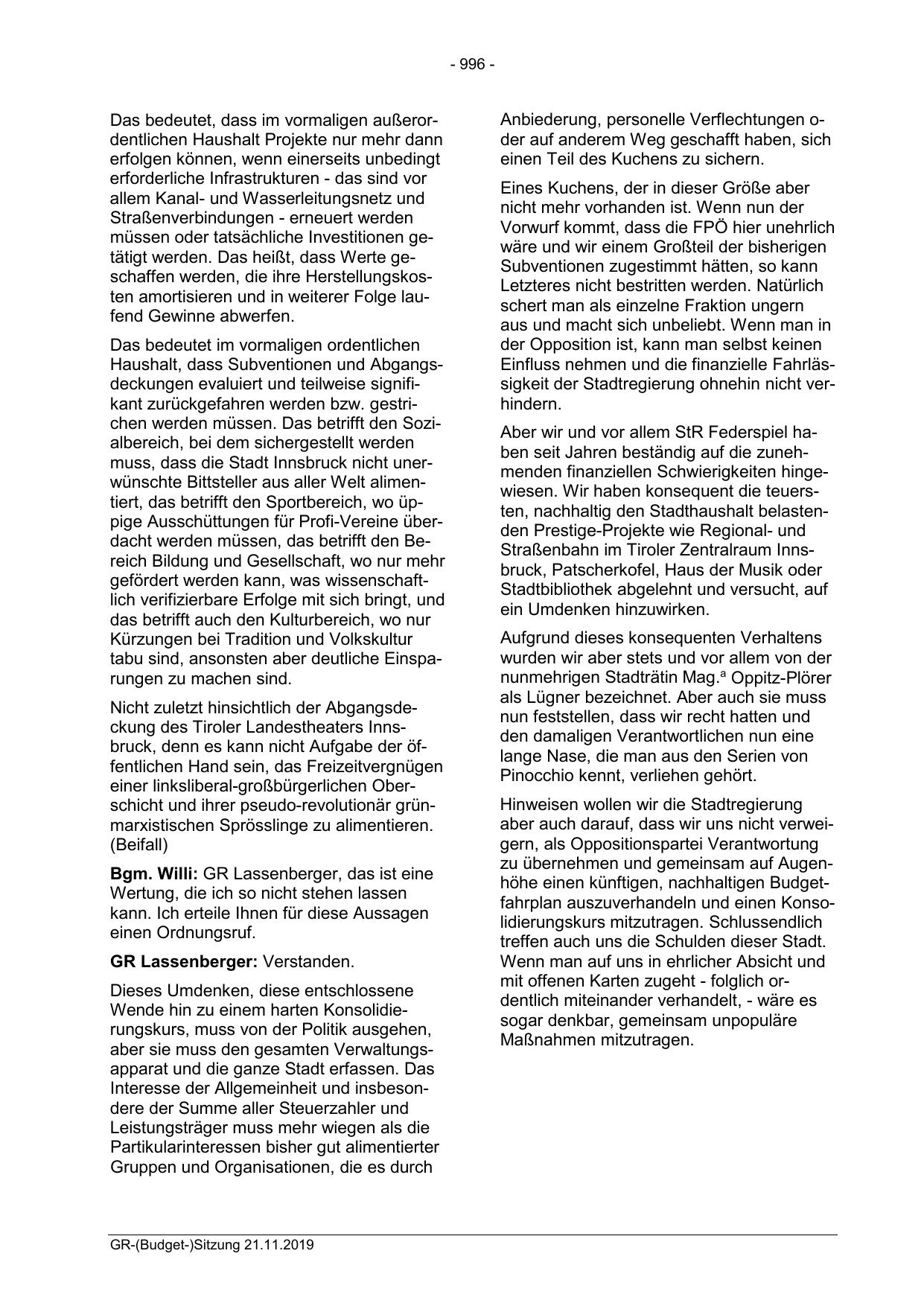 muss, dass die Stadt Innsbruck nicht unerwünschte Bittsteller aus aller Welt alimentiert, das betrifft den Sportbereich, wo üppige Ausschüttungen für Profi-Vereine überdacht werden müssen, das betrifft den Bereich Bildung und Gesellschaft, wo nur mehr