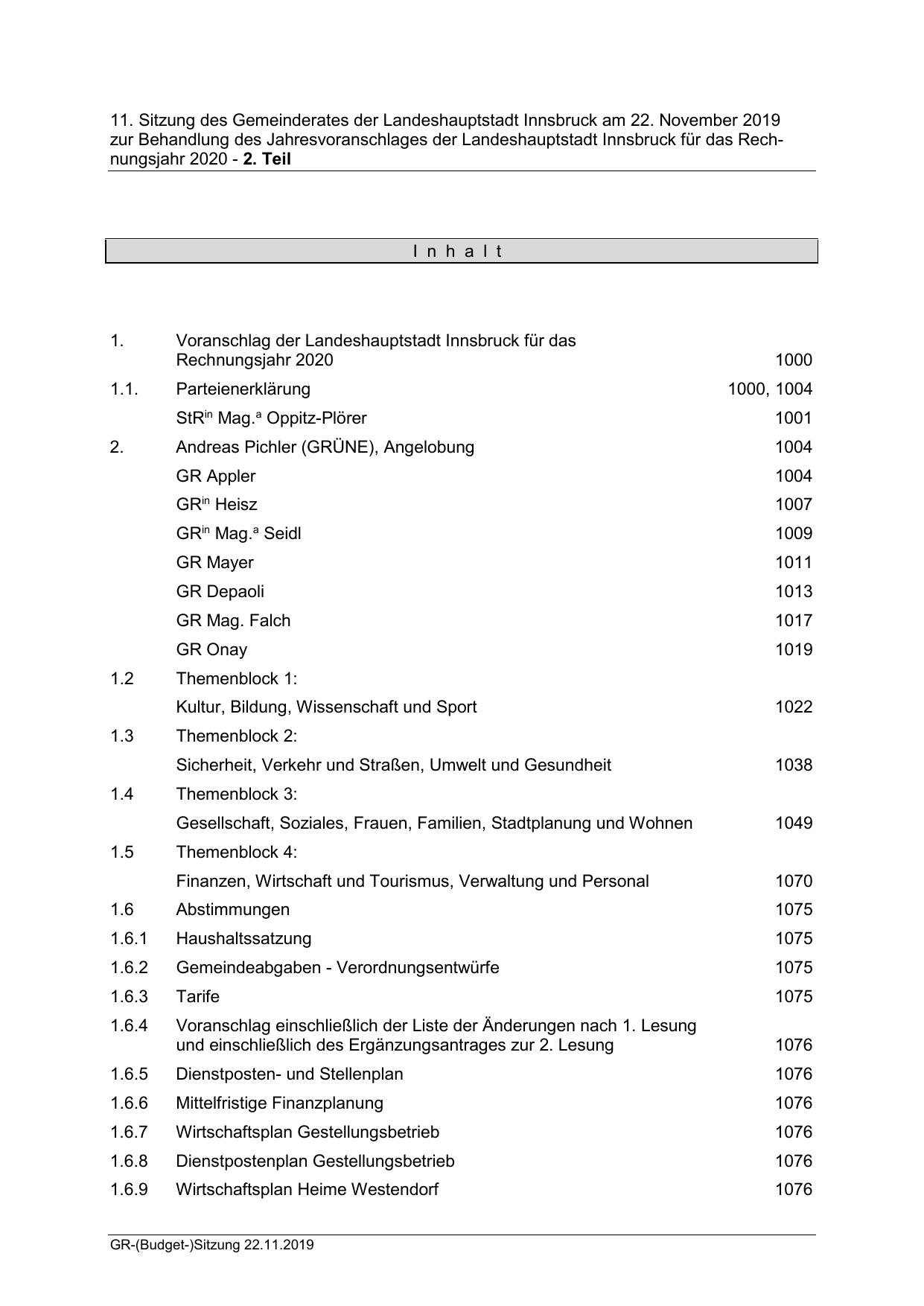 11. Sitzung des Gemeinderates der Landeshauptstadt Innsbruck am 22. November 2019