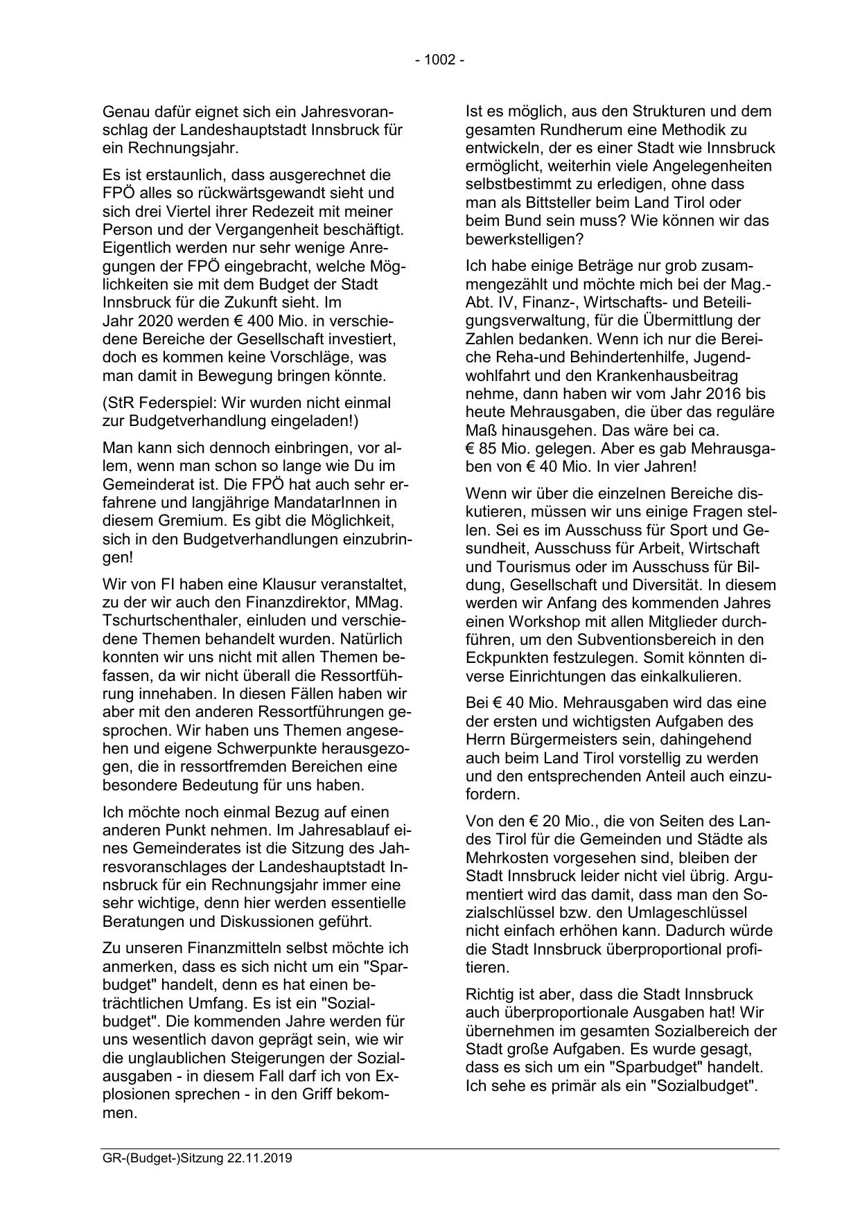 anderen Punkt nehmen. Im Jahresablauf eines Gemeinderates ist die Sitzung des Jahresvoranschlages der Landeshauptstadt Innsbruck für ein Rechnungsjahr immer eine