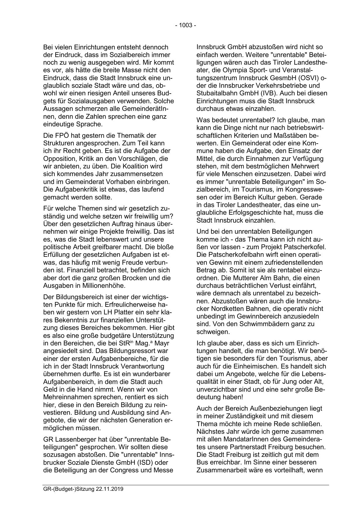 Eindruck, dass die Stadt Innsbruck eine unglaublich soziale Stadt wäre und das, obwohl wir einen riesigen Anteil unseres Budgets für Sozialausgaben verwenden. Solche