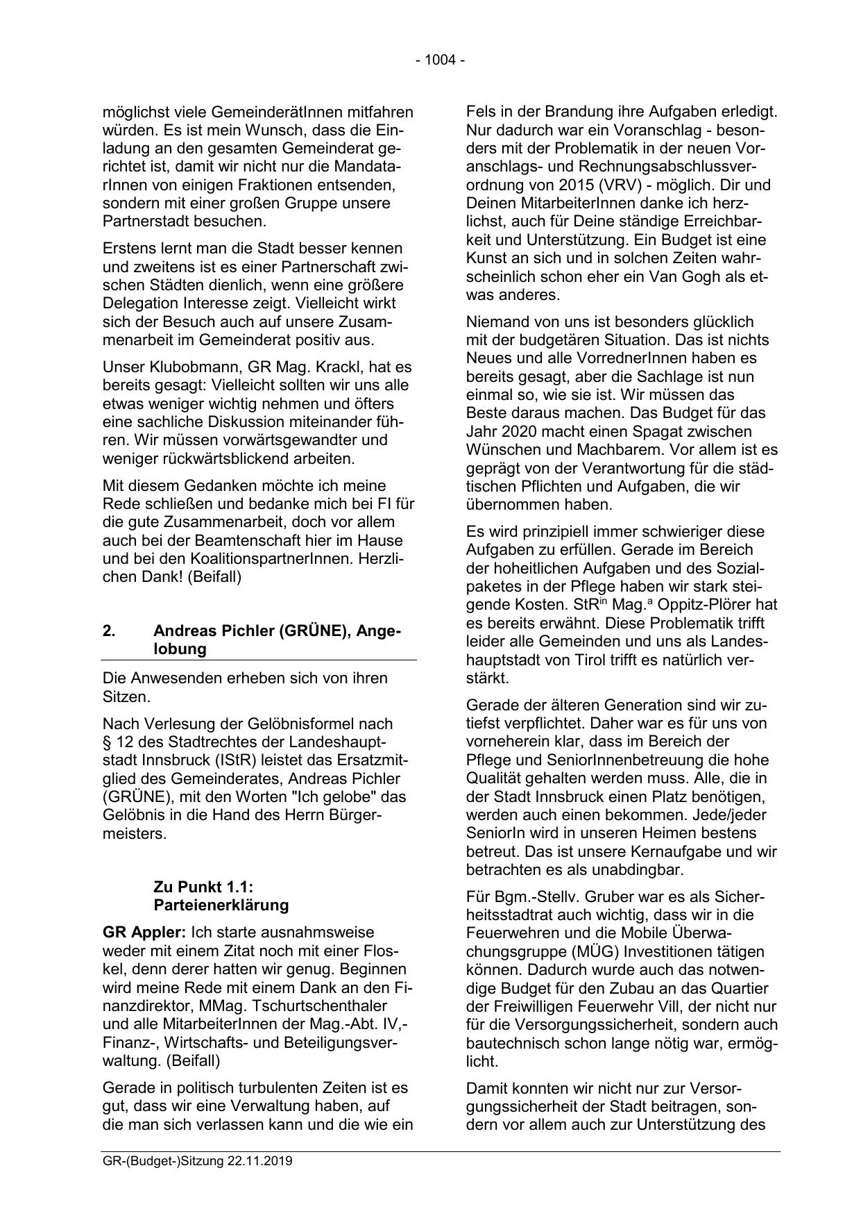 § 12 des Stadtrechtes der Landeshauptstadt Innsbruck (IStR) leistet das Ersatzmitglied des Gemeinderates, Andreas Pichler
