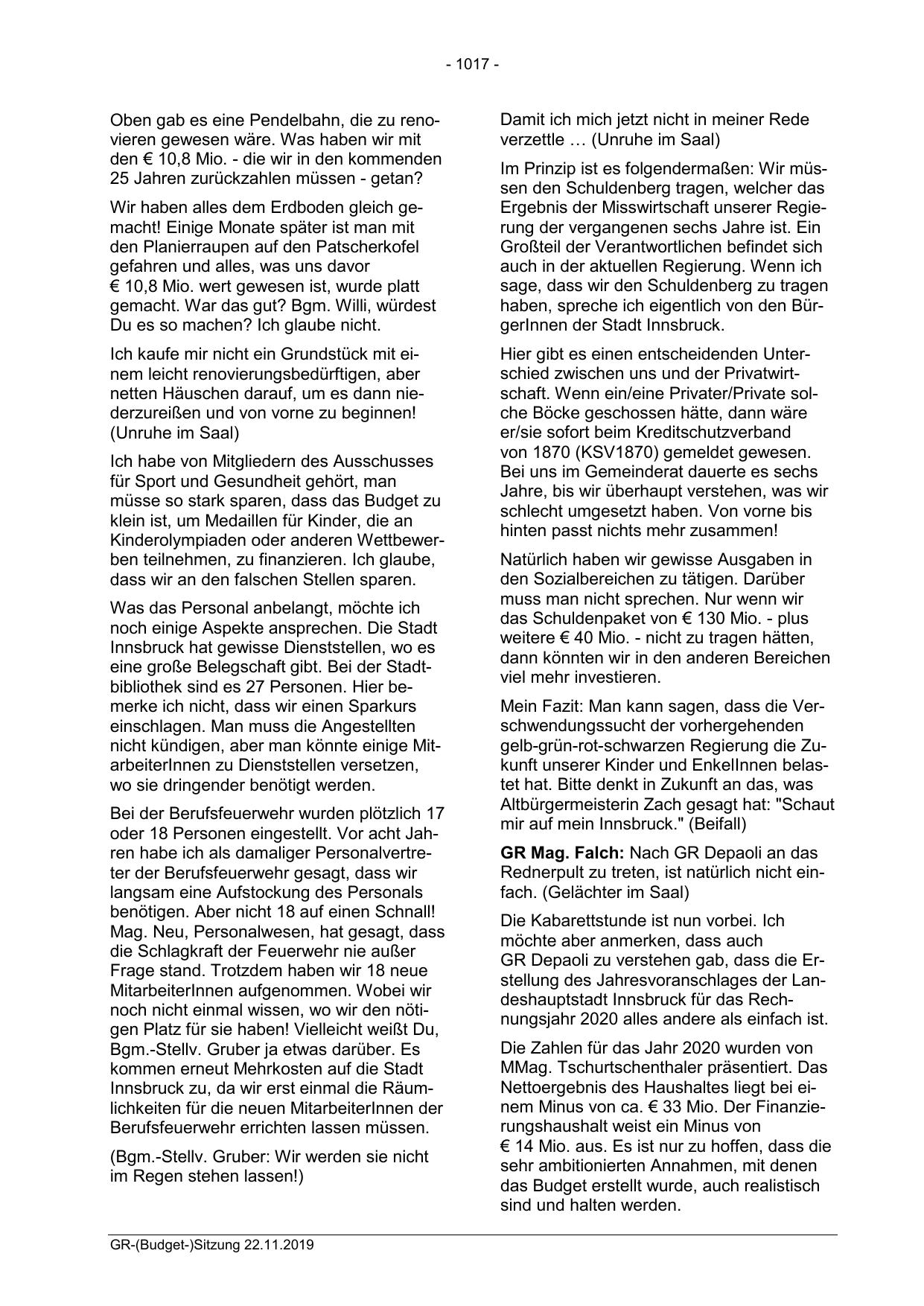 GR Depaoli zu verstehen gab, dass die Erstellung des Jahresvoranschlages der Landeshauptstadt Innsbruck für das Rechnungsjahr 2020 alles andere als einfach ist.