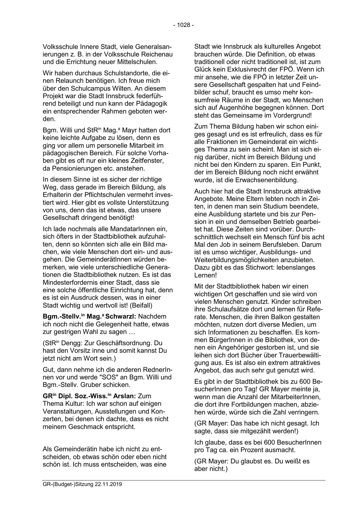 sich öfters in der Stadtbibliothek aufzuhalten, denn so könnten sich alle ein Bild machen, wie viele Menschen dort ein- und ausgehen. Die GemeinderätInnen würden bemerken, wie viele unterschiedliche Generationen die Stadtbibliothek nutzen. Es ist das