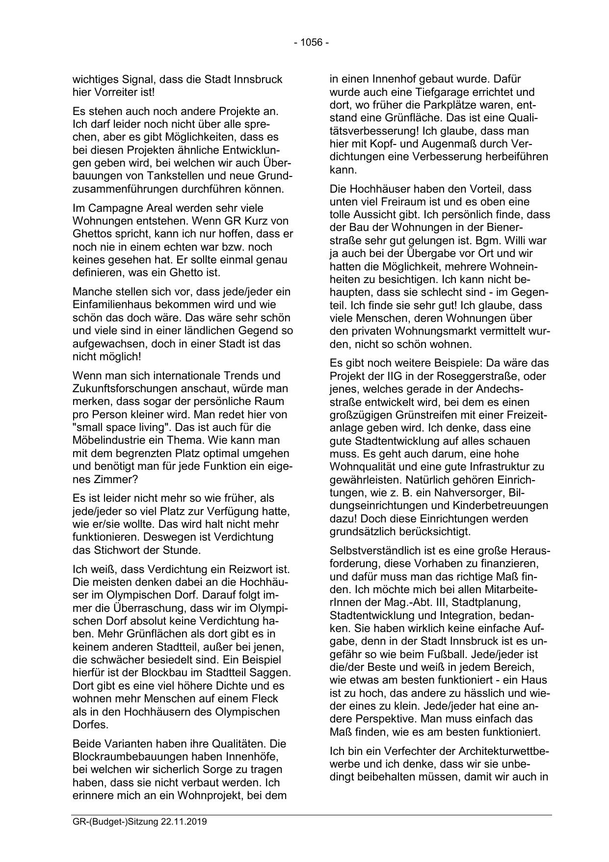 Stadtentwicklung und Integration, bedanken. Sie haben wirklich keine einfache Aufgabe, denn in der Stadt Innsbruck ist es ungefähr so wie beim Fußball. Jede/jeder ist