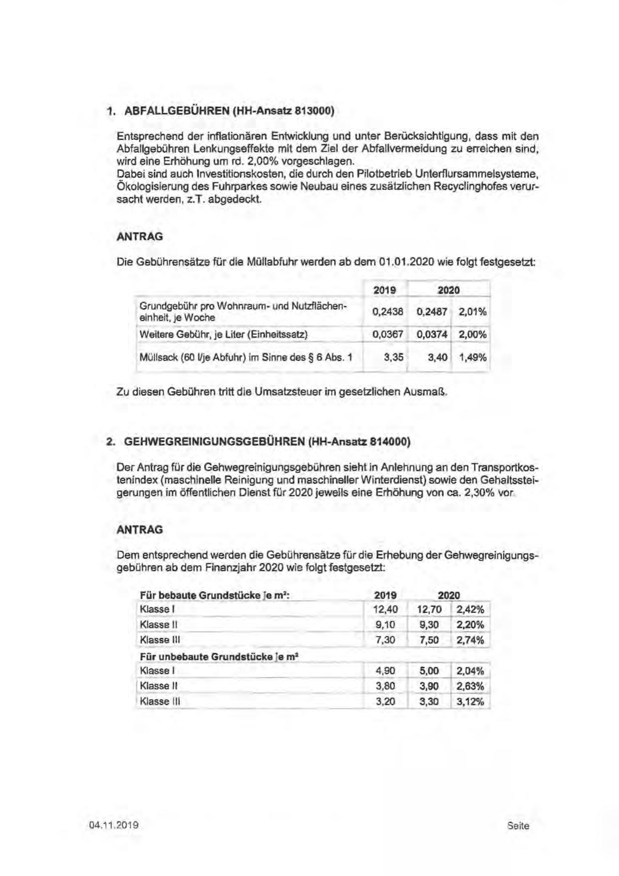 Der Antrag für die Gehwegreinigungsgebühren sieht in Anlehnung an den Transportkostenindex (maschinelle Reinigung und maschineller W interdienst) sowie den Gehaltssteigerungen im öffentlichen Dienst für 2020 jeweils eine Erhöhung von ca. 2,30% vor.