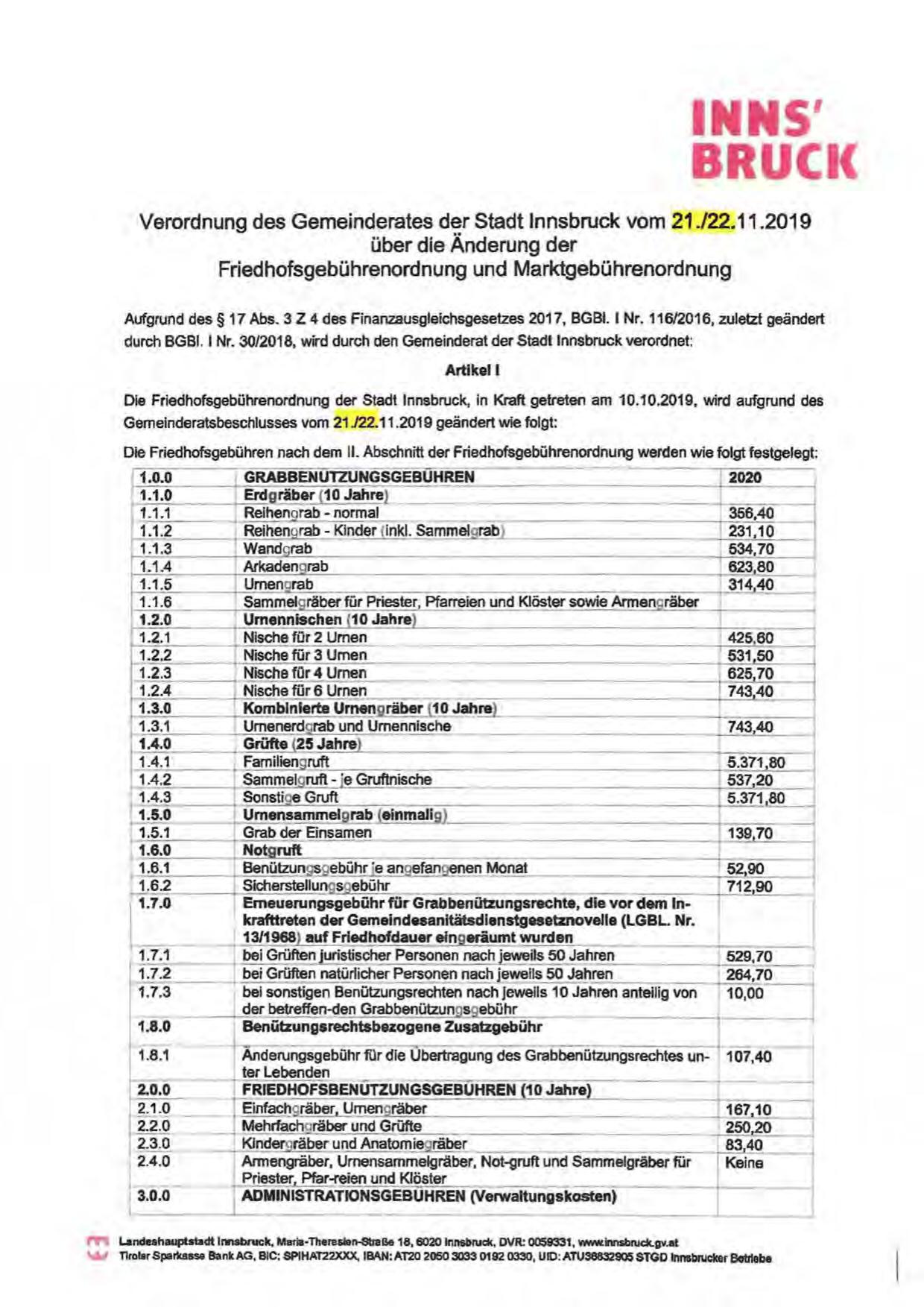 Die Friedhofsgebührenordnung der Stadt Innsbruck, In Kraft getreten am 10.10.2019, wird aufgrund des