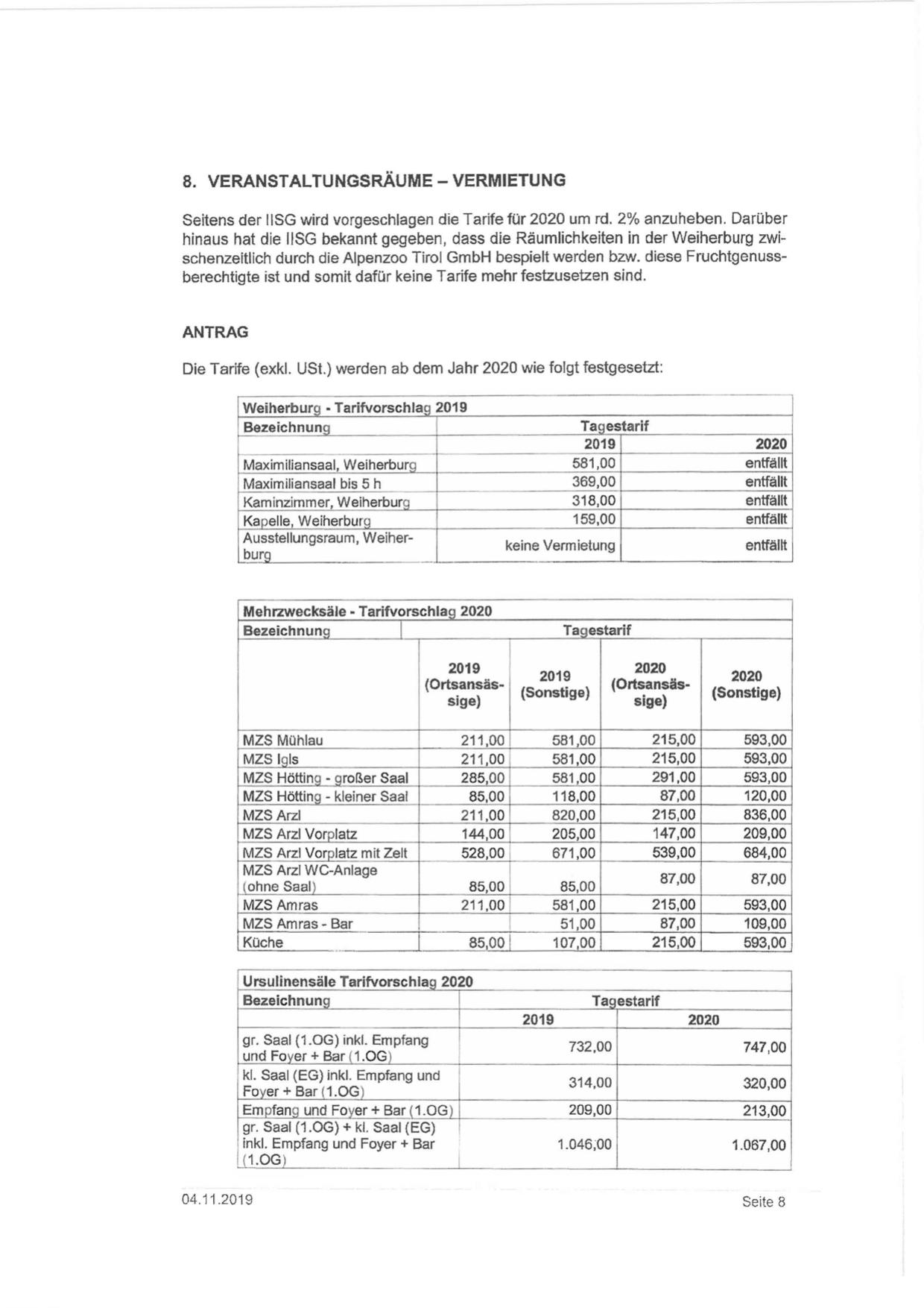 hinaus hat die IISG bekannt gegeben, dass die Räumlichkeiten in der Weiherburg zwischenzeitlich durch die Alpenzoo Tirol GmbH bespielt werden bzw. diese Fruchtgenussberechtigte ist und somit dafür keine Tarife mehr festzusetzen sind.