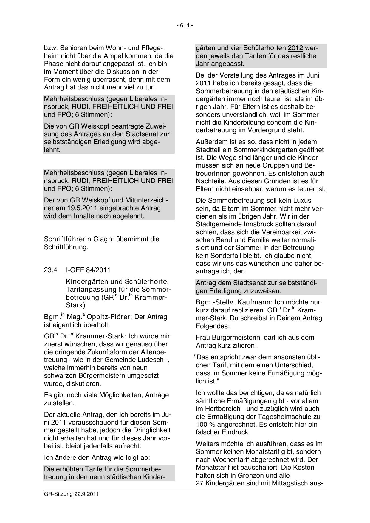 Die erhöhten Tarife für die Sommerbetreuung in den neun städtischen KinderGR-Sitzung 22.9.2011