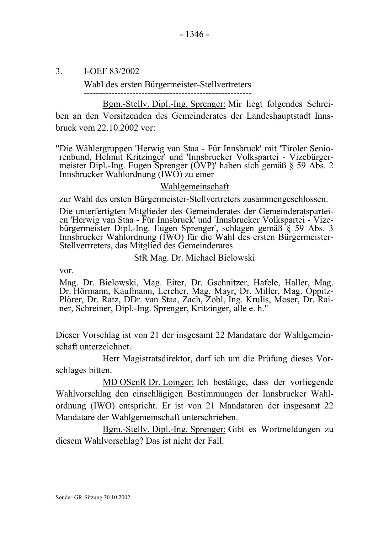 Die unterfertigten Mitglieder des Gemeinderates der Gemeinderatsparteien "Herwig van Staa - Für Innsbruck" und "Innsbrucker Volkspartei - Vizebürgermeister Dipl.-Ing. Eugen Sprenger", schlagen gemäß § 59 Abs. 3