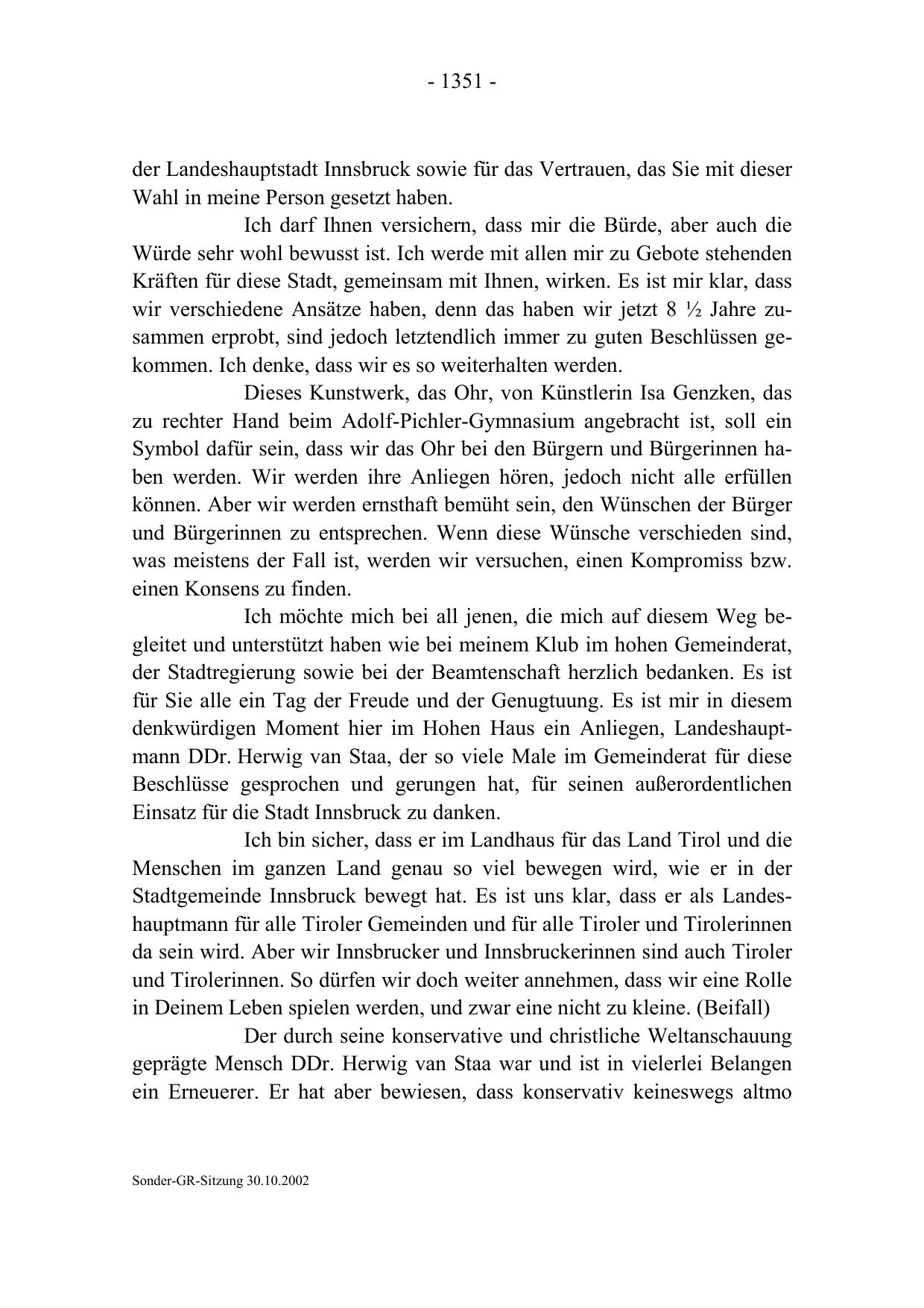 denkwürdigen Moment hier im Hohen Haus ein Anliegen, Landeshauptmann DDr. Herwig van Staa, der so viele Male im Gemeinderat für diese