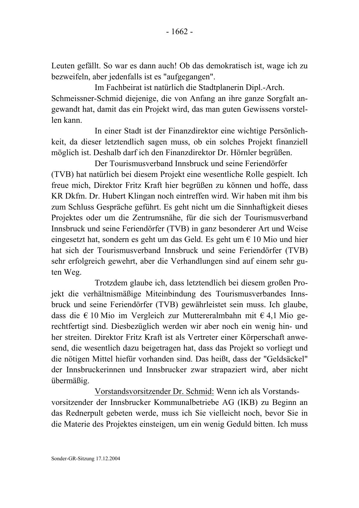 Trotzdem glaube ich, dass letztendlich bei diesem großen Projekt die verhältnismäßige Miteinbindung des Tourismusverbandes Innsbruck und seine Feriendörfer (TVB) gewährleistet sein muss. Ich glaube,