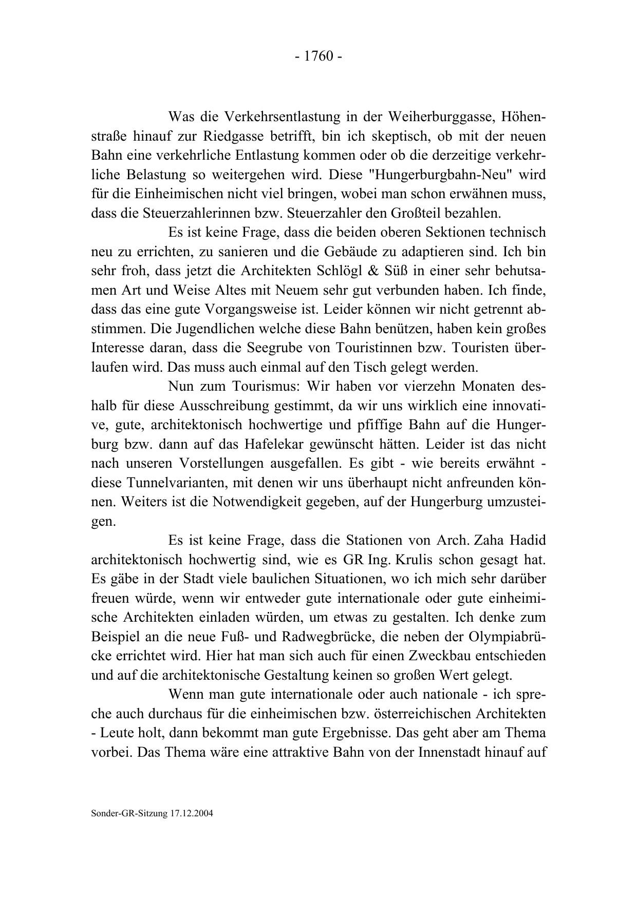 nach unseren Vorstellungen ausgefallen. Es gibt - wie bereits erwähnt diese Tunnelvarianten, mit denen wir uns überhaupt nicht anfreunden können. Weiters ist die Notwendigkeit gegeben, auf der Hungerburg umzusteigen.